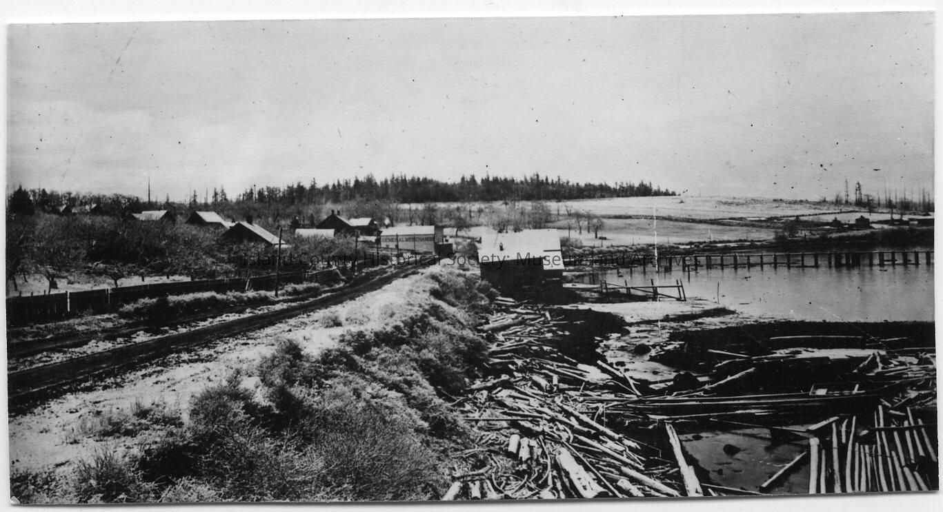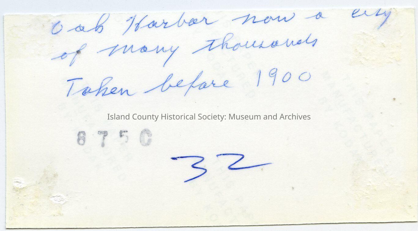 Black and white photo of a dirt road along the shore, logs - driftwood, pier, buildings. On the back of the photo: Oak Harbor now a city of many thousands taken before 1900. Pictures used in book, "Whidbey Island Memories: Screwball Things I Remember." Caption: Very early Oak Harbor street scene. Photo No. 32, Page 42. Photograph provided to author by: O.H.H.S..Lexicon