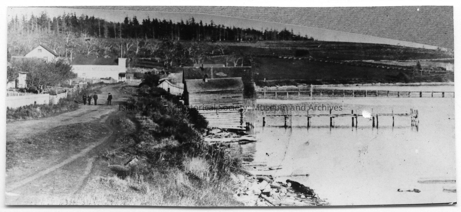 Black and white photo of a group of four men on a dirt road along the shore and in front of a building with a pier; logs - driftwood, pier, buildings. Pictures used in book, "Whidbey Island Memories: Screwball Things I Remember." Caption: Early Oak Harbor street scene. Photo No. 33, Page 42. Photograph provided to author by: Paul Allen.Lexicon