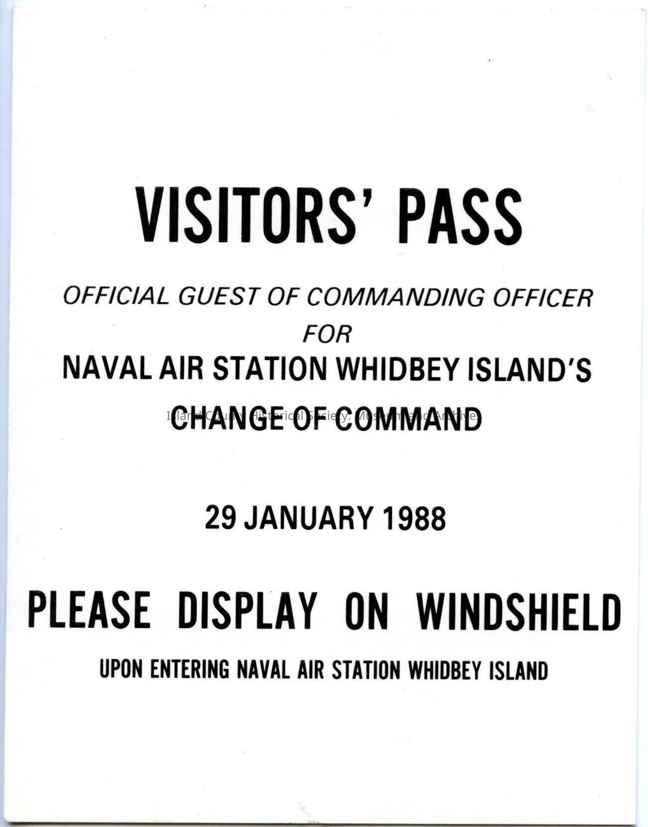 Parking Pass card: Official Guest of Commanding Officer for Naval Air Station, Change of Command Ceremony. January 29, 1988.