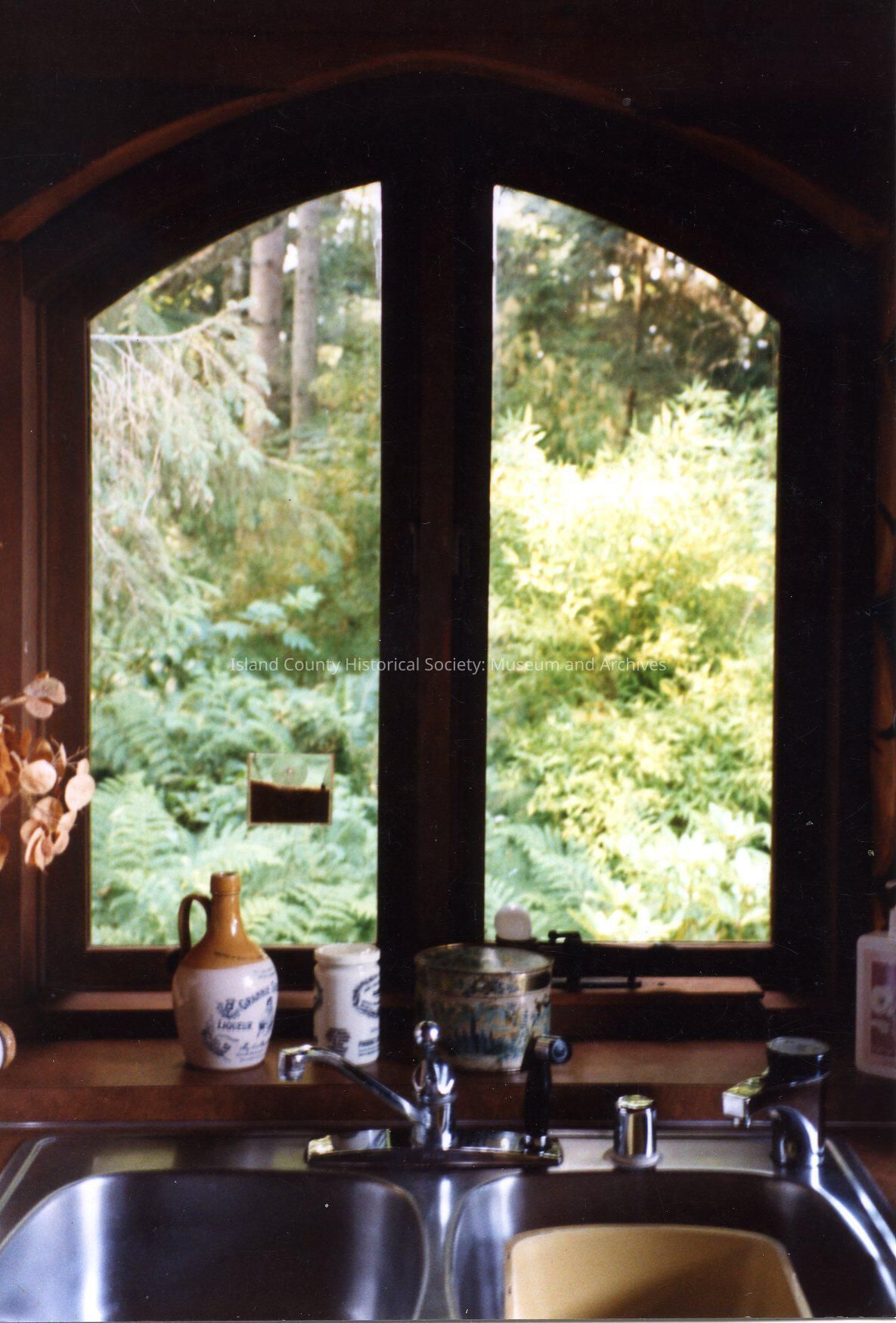 Guest House Bed & Breakfast, Greenbank. Lodge kitchen. Double sink in front of large window with ferns and conifers outside. Window is two panes in heavy wood frames wtih arched top. Decorative jars on sill.