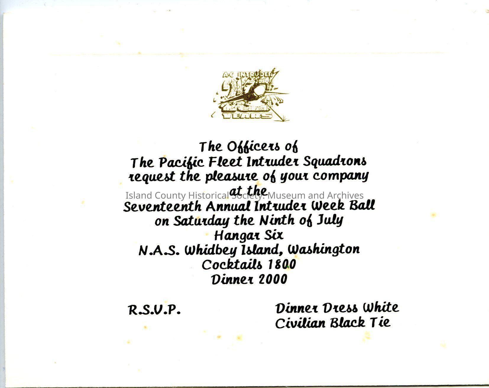 Invitation card: The Officers of the Pacific Fleet Intruder Squadron request the pleasure of your company at the 17th Annual Intruder Week Ball, July 9 (no year given).