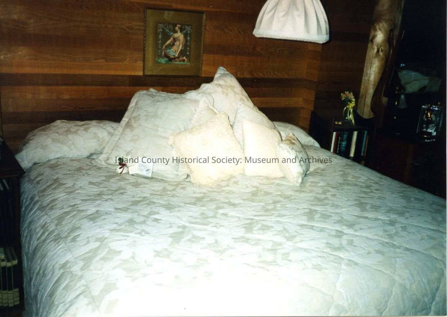 Guest House Bed & Breakfast, Greenbank. Lodge bedroom. Planked walls with log post. Bed with many pillows and comforter. Hanging lamp above has fabric shade. Bookshelves to right of bed. Print on wall above bed.