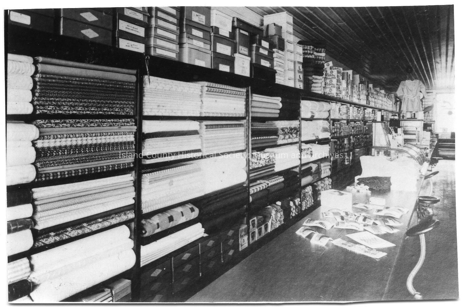 Black and white photo of a grocery store. Other side of store in 2016.055.036. Boxes and bolts of material. Pictures used in book, "Whidbey Island Memories: Screwball Things I Remember." Caption: Byrne Store Dry Goods section. Photo No. 39, Page 44. Photograph provided to author by: Paul Allen.