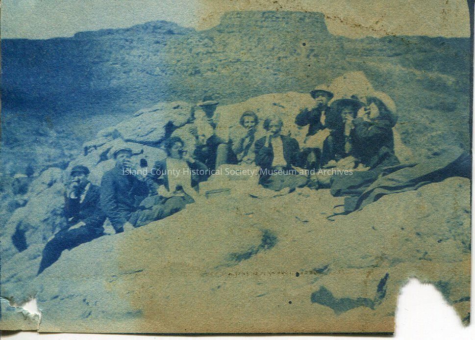 A faded photo of a group of people sitting on rocks in what looks like a southwestern state. There are rock formations in the background. There are nine people in the photo. The majority are wearing hats. Everyone in the photo is holding a cup or makeshift cup to their mouths. The back of the photo says, "Picnic day. drinking from orange peeling goblets".