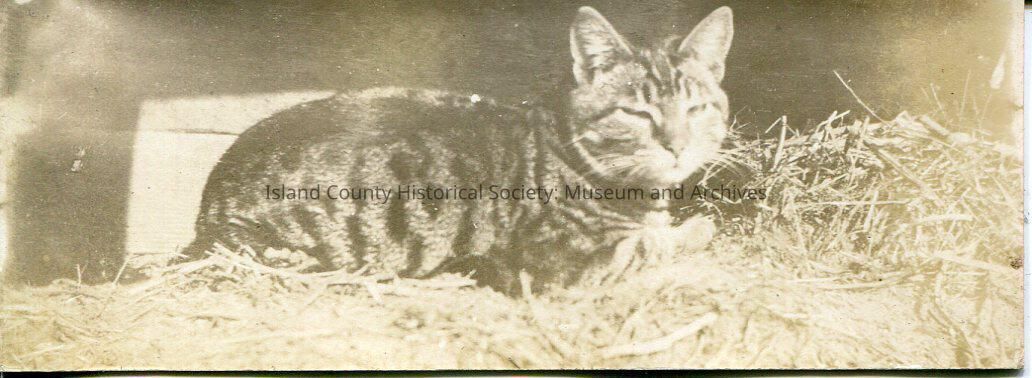 A black and white photo of a cat laying in straw. The cat is striped and it's eyes are partically closed.