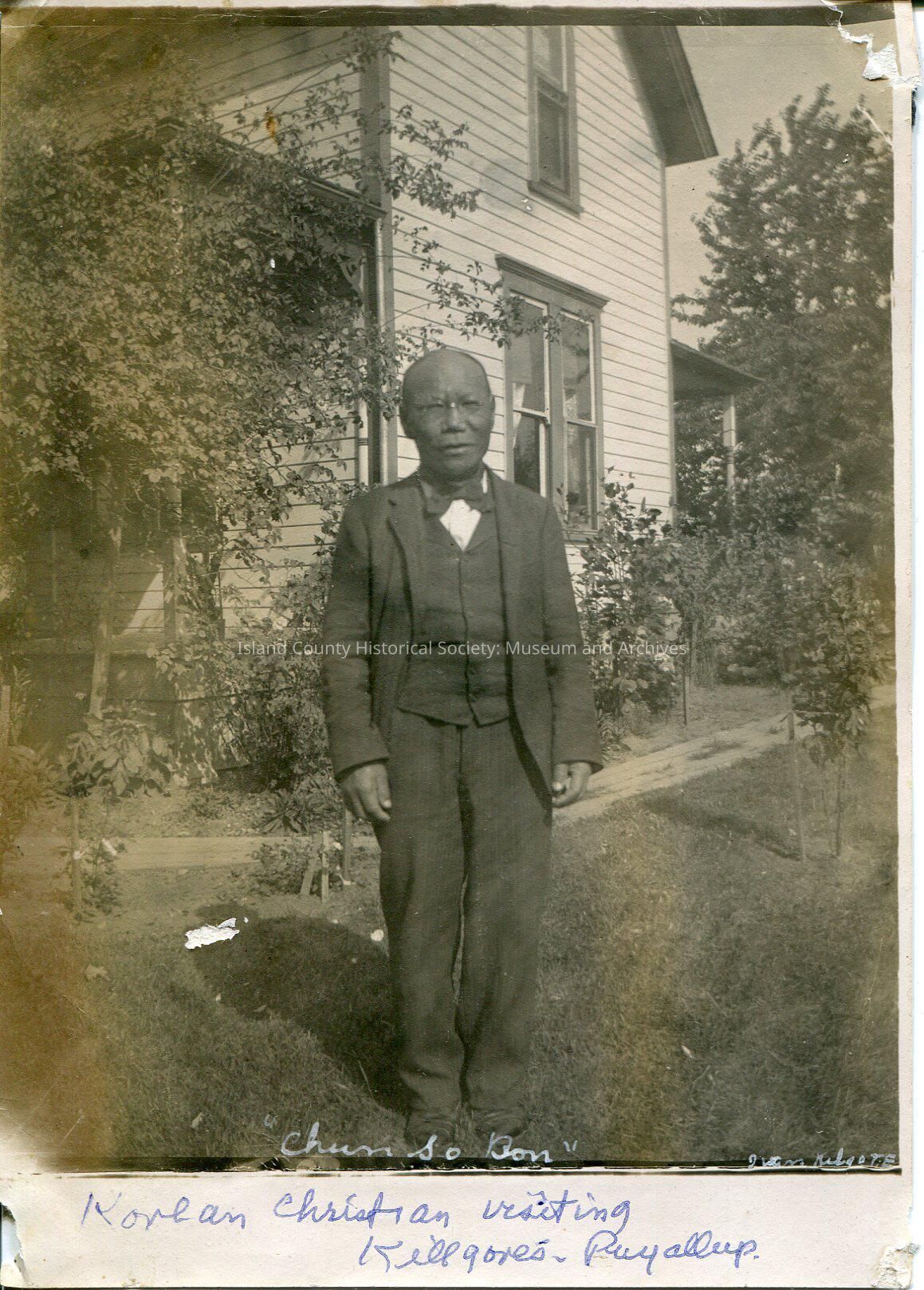 A black and white photo of a man standing outside, in front of a house. The man is wearing a suit with a bow tie and glasses. The bottom of the photo says, "Chum So Bon. Korean Christian visiting Killgores, Puyallup".