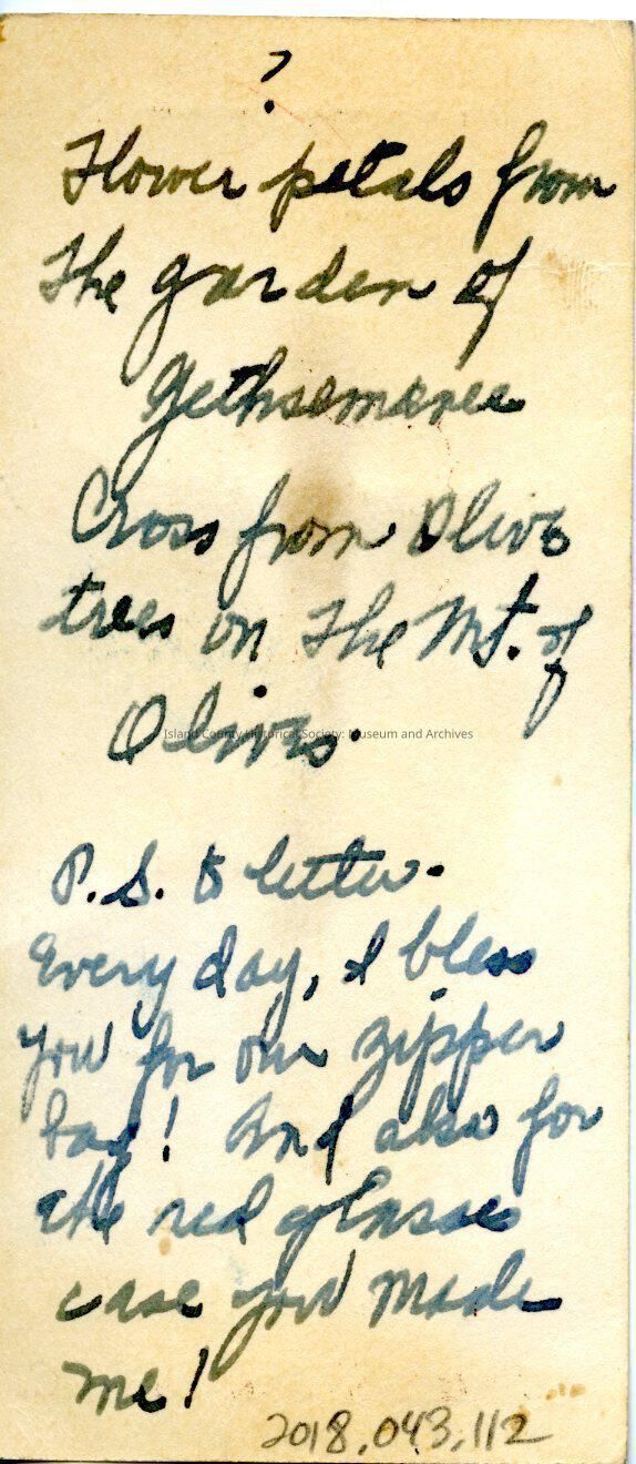 Religious bookmark: Wooden cross in the vente with a wreath/crown of thorns behind it. Jerusalem at the top. At the bottom: Ex Olivis Gesthemani, Tetigit SS. Sep D.N.J.C. Note on back: Flower petals from the garden of Gesthemanie. Cross from Olive trees on the Mt. of Olives. P.S. to letter: Every day, I bless you for our zipper bag! And also for the red glasses case you made me!