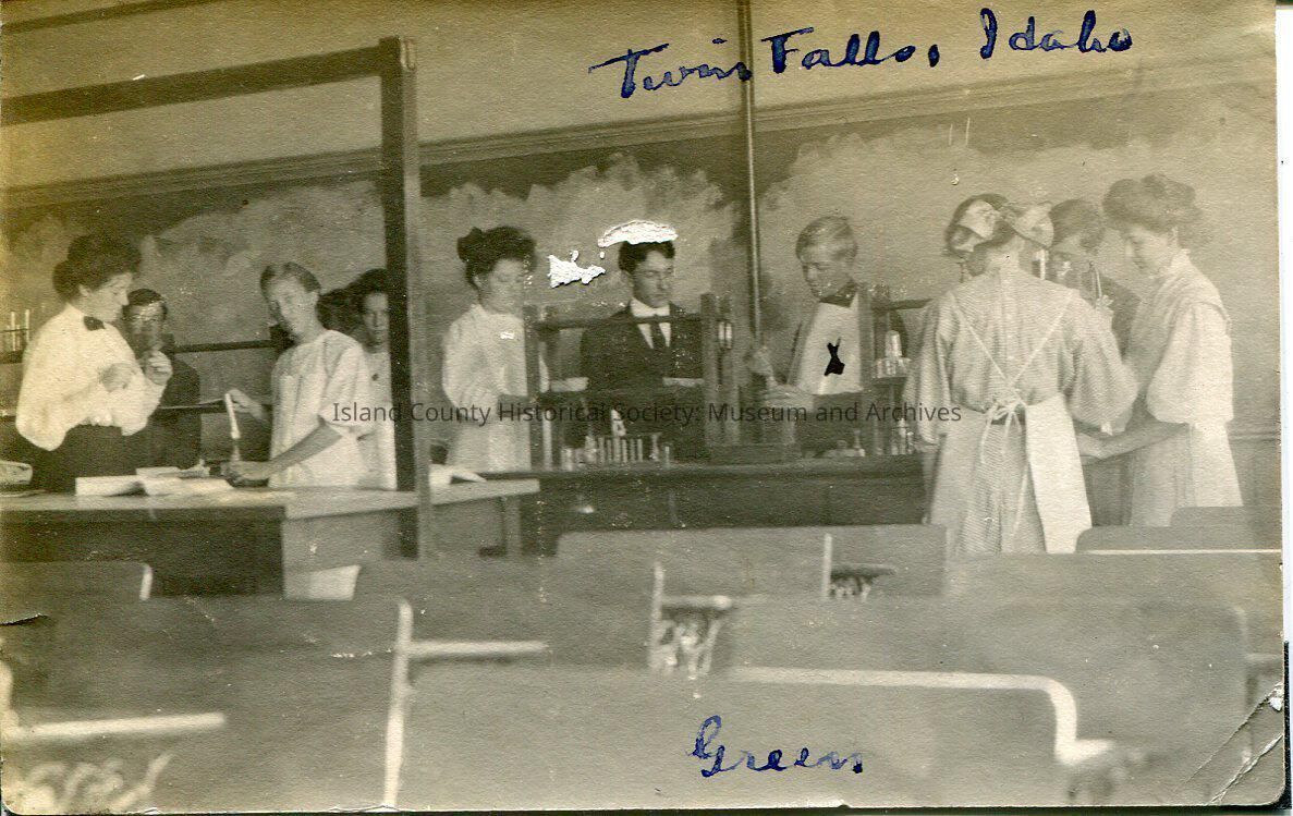 A black and white photo of a group of people standing in a laboratory. There are about six women and four men pictured. The men are wearing suits and the majority of the women are wearing dresses with smocks. All of the women have their hair up. There are also desks in the foreground indicating the lab is probably part of a school. The top of the photo says, "Twin Falls, Idaho," the bottom of the photo says, "green," and the back of the photo says, "Geo. Kellog, Chem. Lab".Lexicon