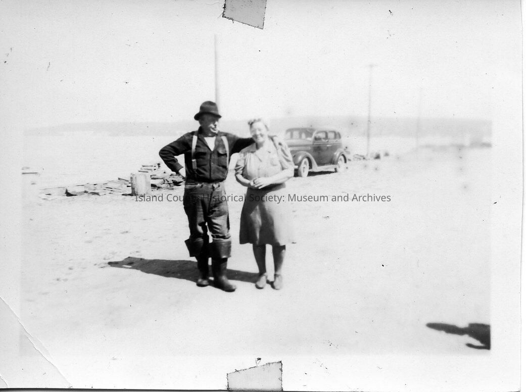 Photo of Harry and Grace Dines taken in the mid 1940's, along the shore with car in background, Dines were owners of Dines Pt. Resort on Holmes Harbor.