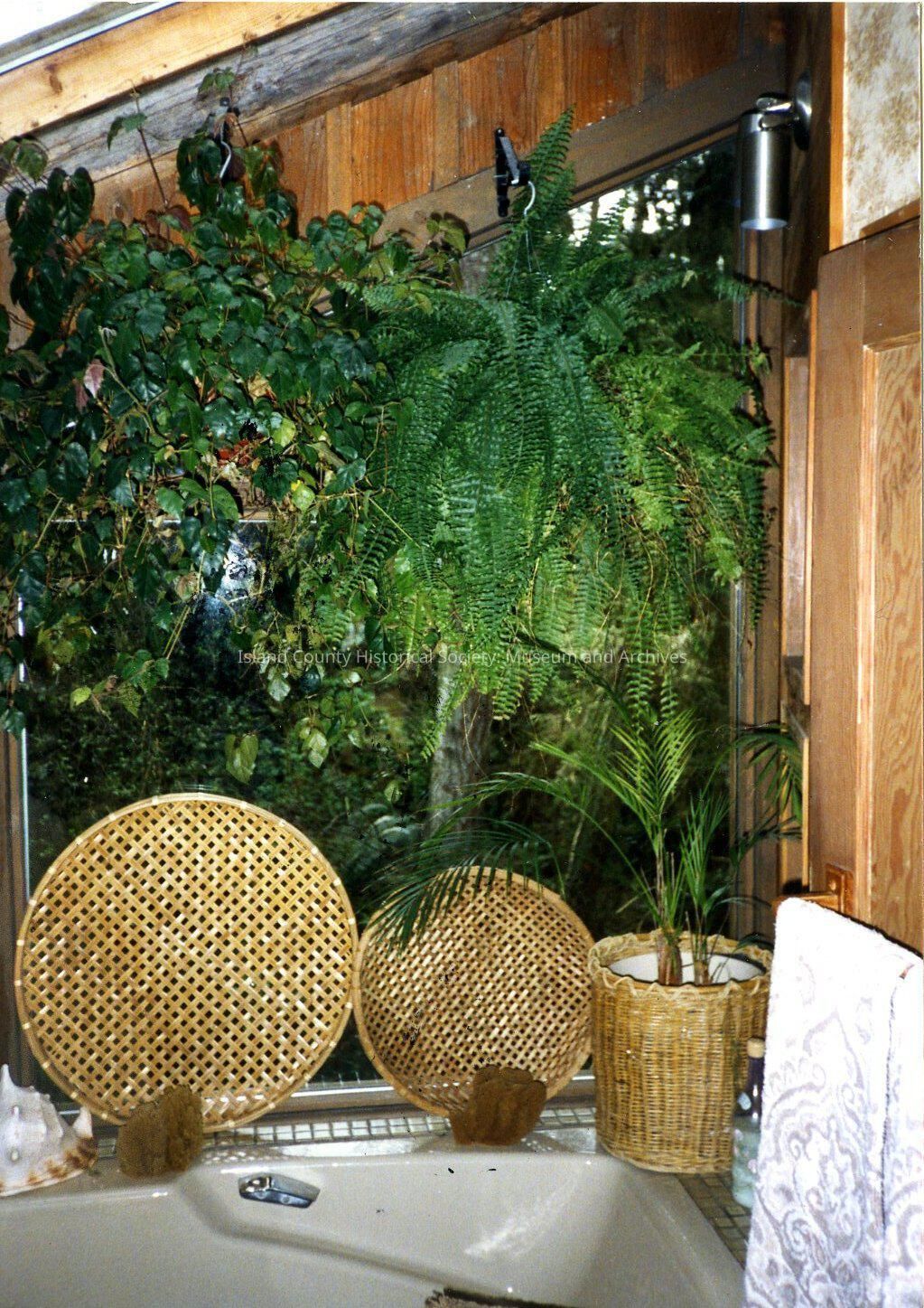 Guest House Bed and Breakfast. Greenbank. Lodge upstairs bathroom. Large window with hanging plants inside and forest outside. Corner of tub with wicker baskets, fern, sea shell and sponges. Towel on rack.