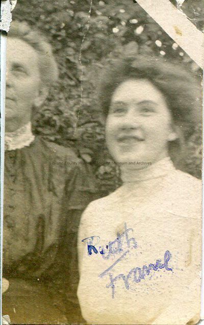 A photo of a young woman standing outside. She is wearing a white blouse, a necklace, and has her hair pulled back. She is smiling at the camera. There is also an older woman standing to her right, but she is partically cut out of the picture. The bottom of the photo says, "Ruth Frame".Lexicon