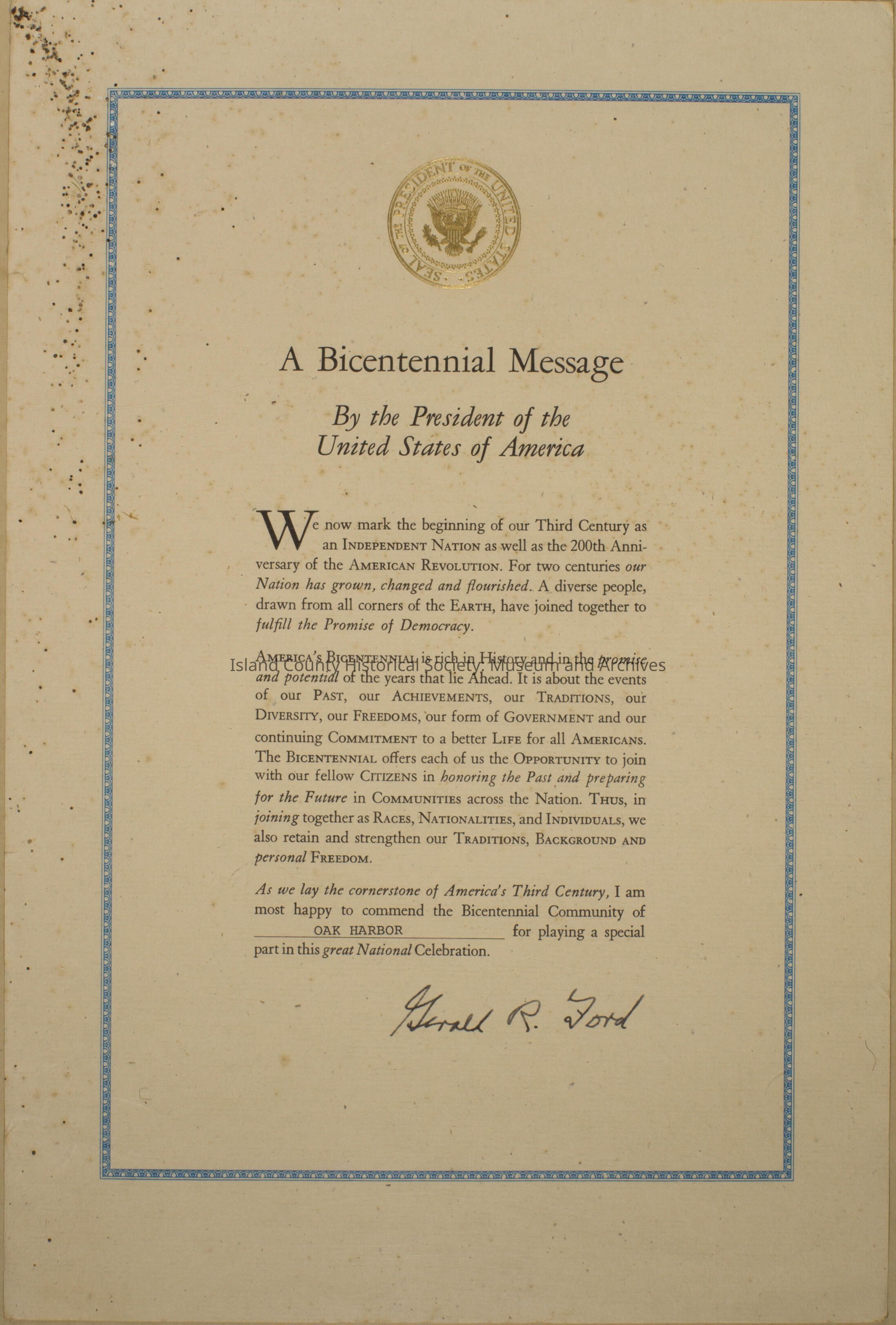 Bicentennial Certificate by the President of the United States of America Gerald R. Ford. Commends the Bicentennial Community of Oak Harbor for playing a part in this great National Celebration.