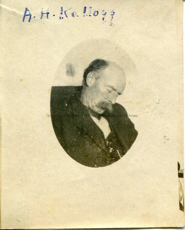 A photo of an older man sleeping while sitting in a chair or on a couch. The man is wearing a suit, has a moustache and is balding. The top of the photo says, "A.H. Kellogg," and the back of the photo says, "dad".Lexicon