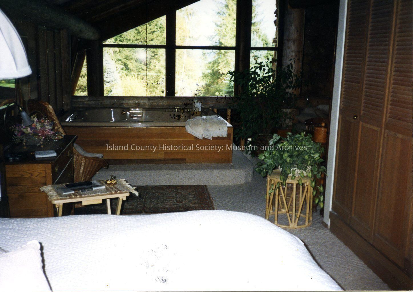 Guest House Bed and Breakfast. Greenbank. Lodge upstairs bedroom with jacuzzi bath. Tub sits on raised platform. Large window with hanging plants inside and forest outside. Bed in foreground. Chest and small table to left. Closet doors to right.