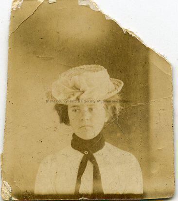 Tiny photo of a young woman, shoulders up, wearing a dress with high collar and droopy bow, hat with ribbons. On the back: Athaleen Weedin sister From the Athaleen Weedin folder