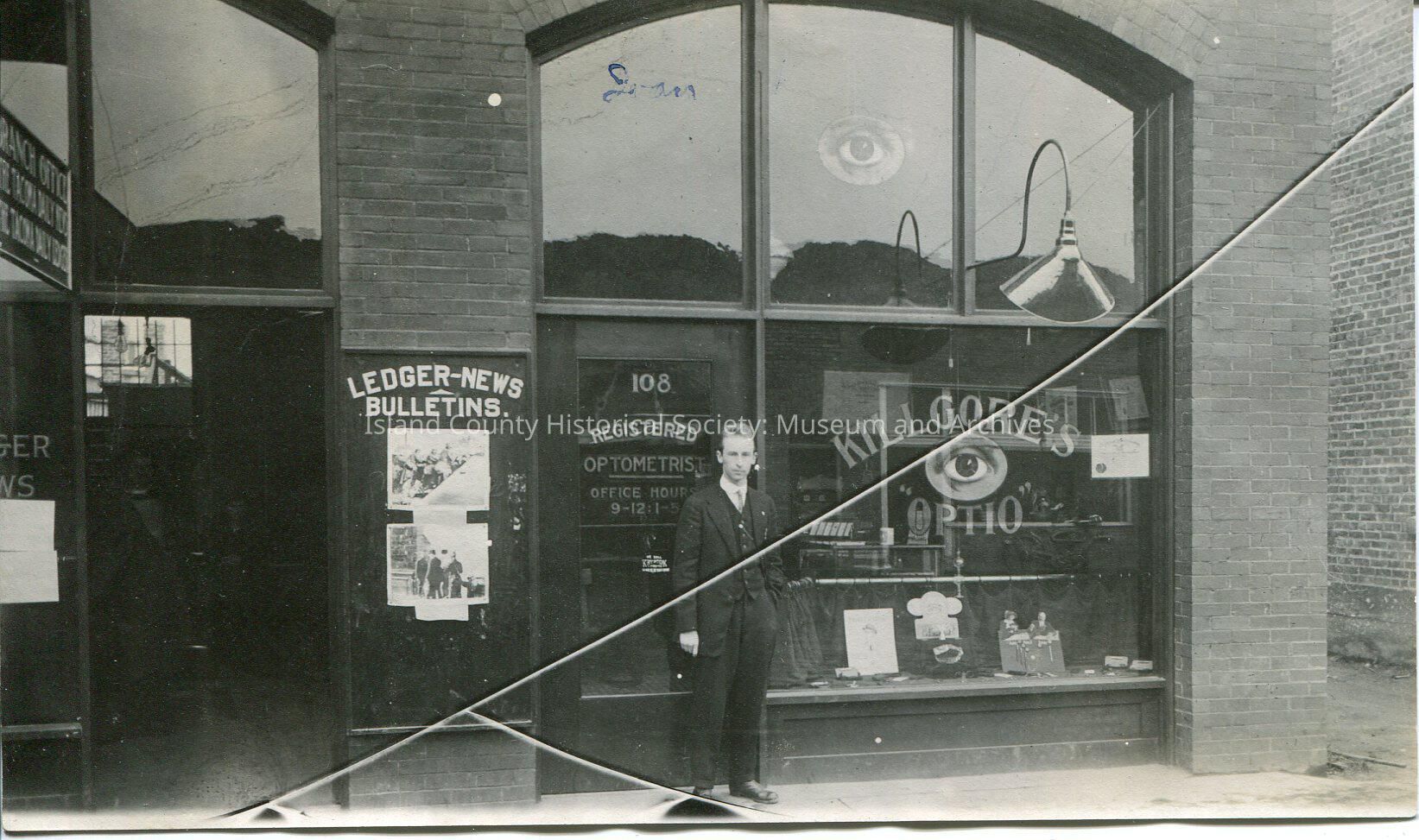 A black and white photo of a man standing in front of a building. The buildings windows say, "Registered Optometrist," "Killgore's 'Optio'". The man is wearing a dark-colored suit and tie. The top of the photo says, "Juan". There is another storefront on the left side of the photo.Lexicon
