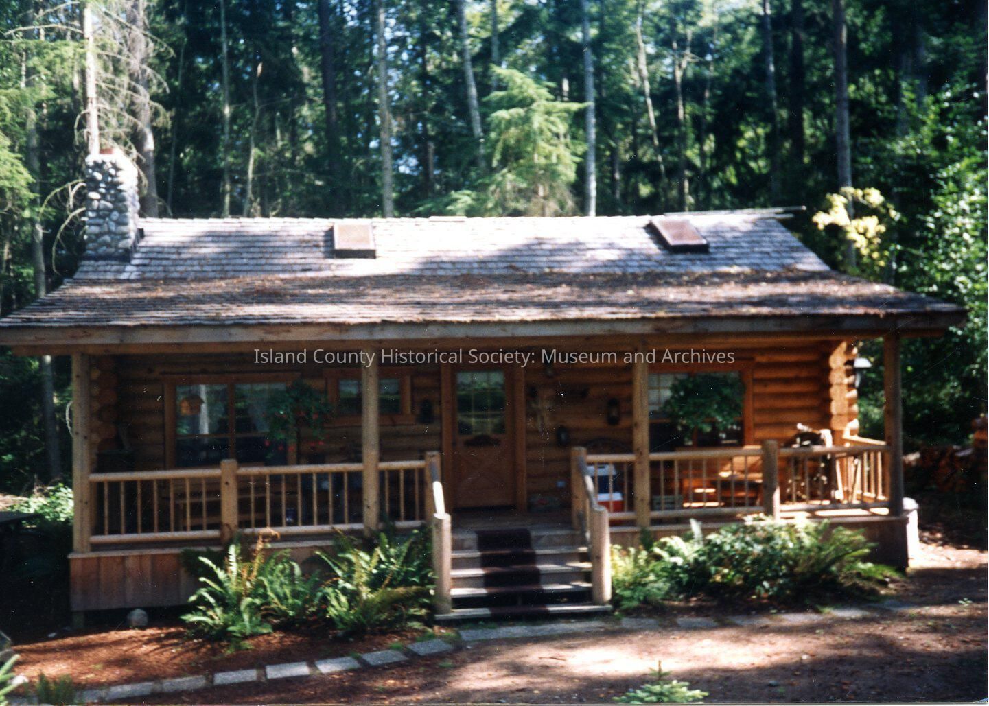 Guest House Bed and Breakfast. Greenbank. Log cabin surrounded by tall trees. One story with stone chimney on left. Two skylights. Cabin has front porch with door and five steps in middle. Ferns in front.