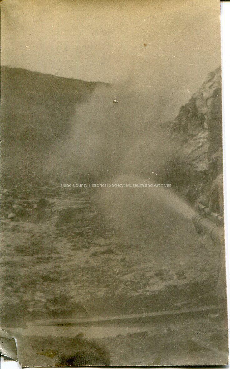 A photo of a person (barely visiable on the right side of the photo) holding what looks like a firehose. The majority of the photo is the stream of water. It looks like the background is just rocks.