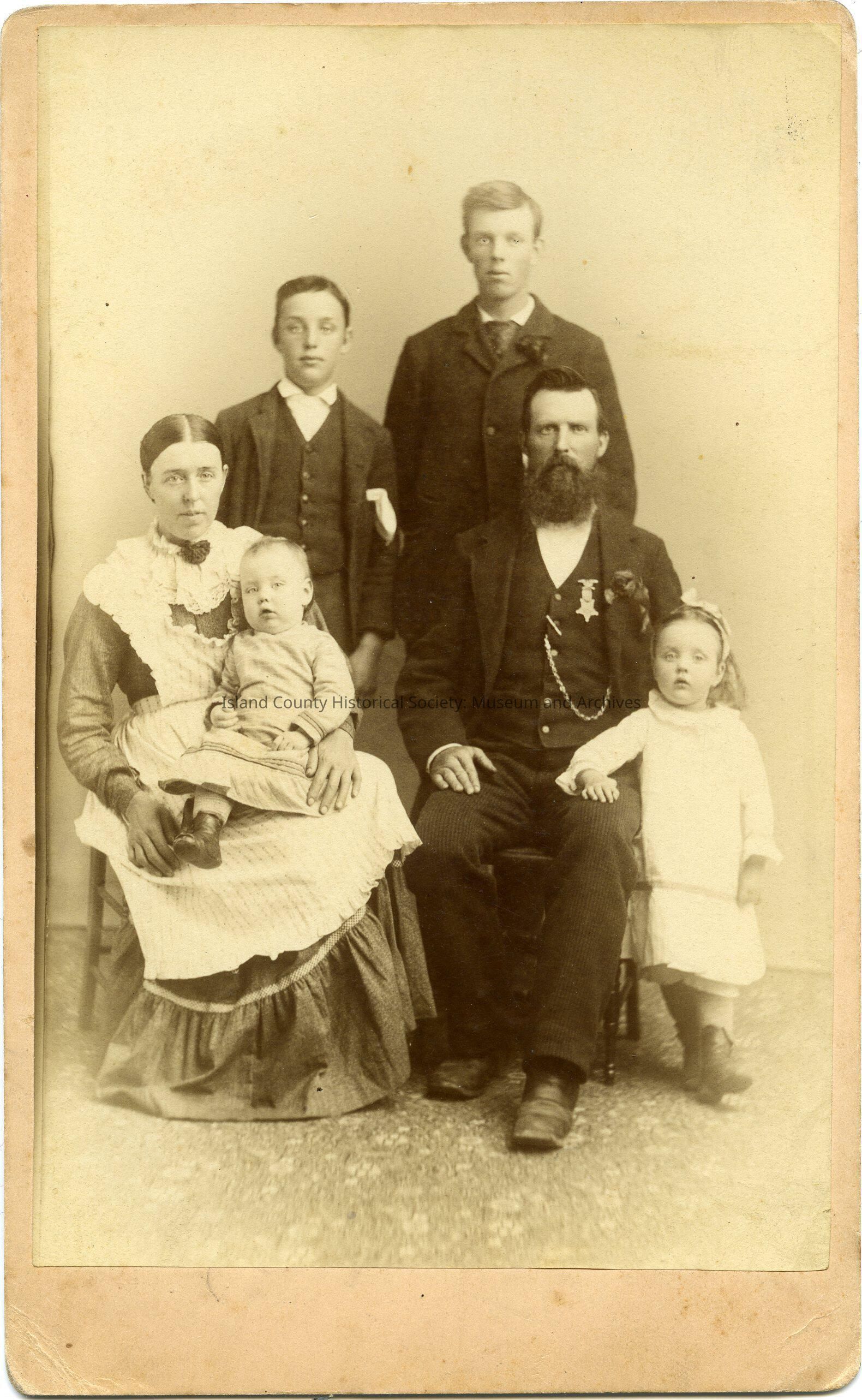 Photo of a family: father sitting on the right, wearing a suit with a medal and wwatch fob, beard and mustache. The mother is sitting on his right wearing a dress with lace collar and striped apron. She is holding a toddler on her lap, wearing a dress. A little girl is on the left of the father, her right arm is on his left thigh, has a bow in her hair. Two youths are standing behind the parents, wearing suits. On the back: Susan Weedin holding Herbert, Luther and Jasper standing; also sitting William Weedin and Rhoda.