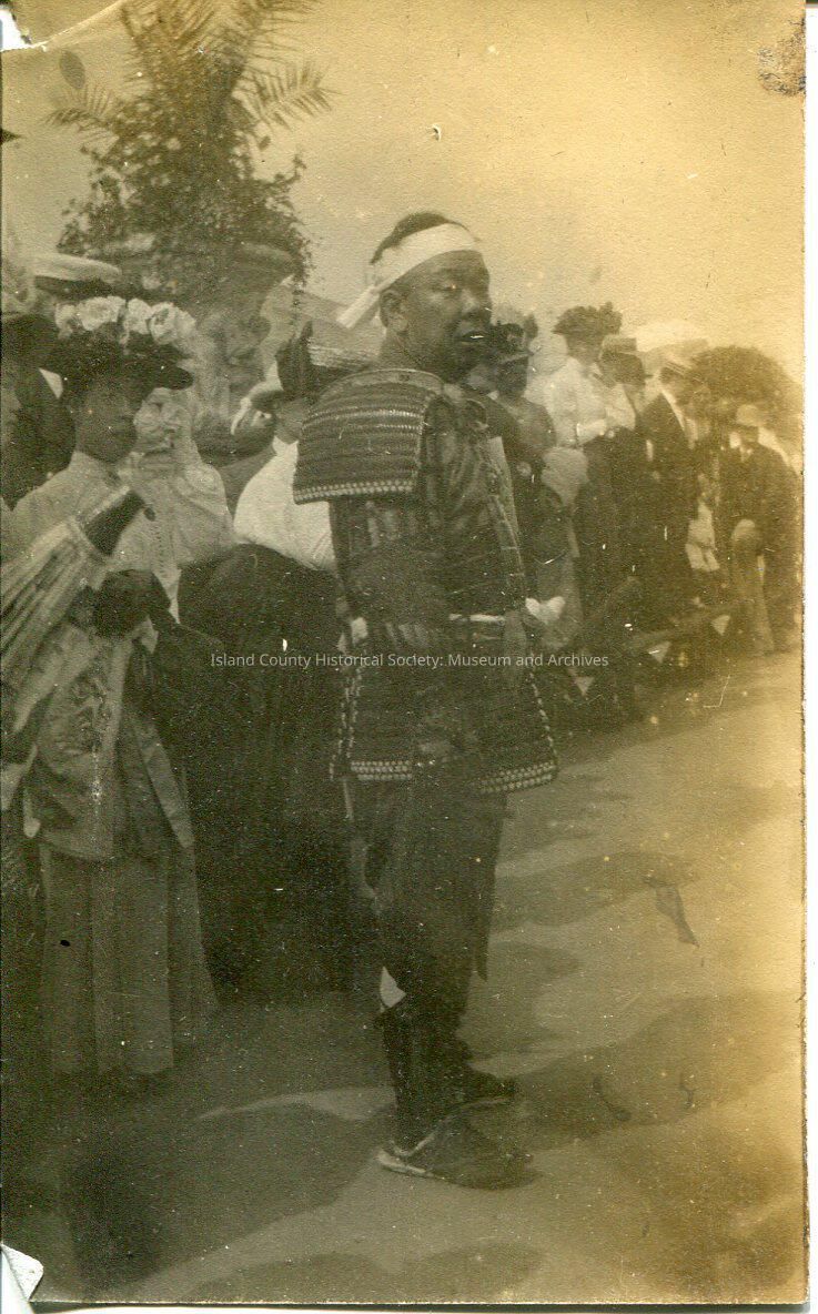A photo of a group of people outside. It looks like the main subject of the photo is an Asian or Native American man dressed in a type of armor/suit. He also is wearing sandles and has a white headband around his head. There are other men in suits and women in dresses and hats in the background.