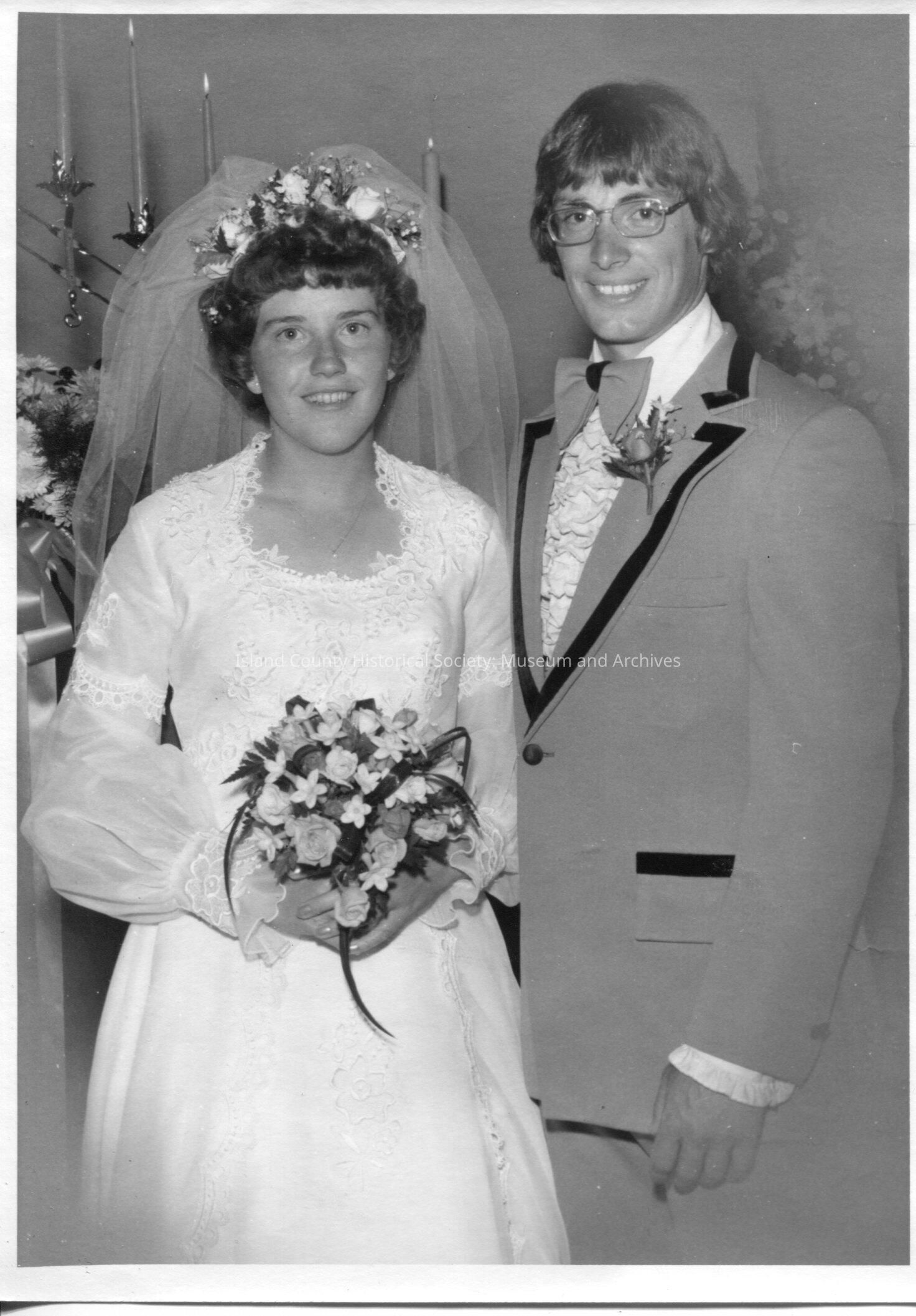 A photo of a couple showing they got married. A handwritten note on the front says "Bishop-Sherman Marriage from DNC." Karen Sherman-Bishop and Wilbur Bishop