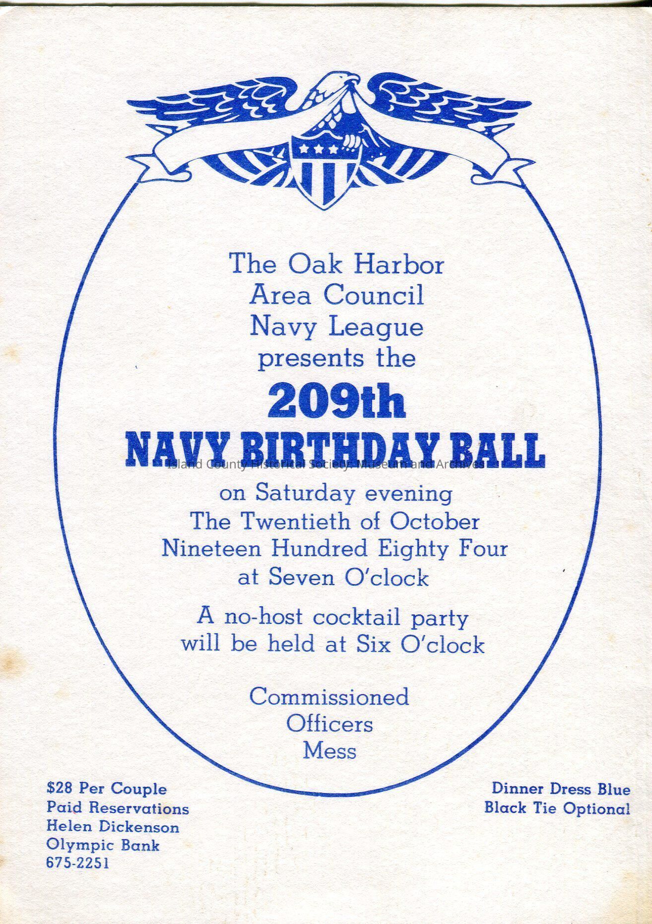 White invitation card: The Oak Harbor Area Council Navy League presents the 209th Navy Birthday Ball on Saturday evening, Oct 20, 1984. At the Commissioned Officers Mess. $28 per couple.