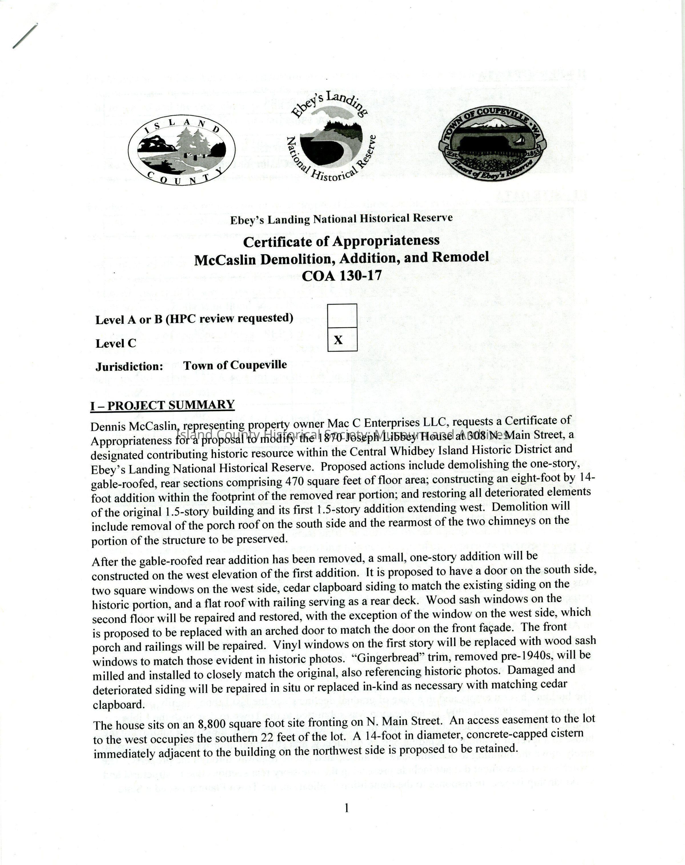 This is a 37-page document from the Ebey's Landing National Historical Reserve on the Certificate of Appropriateness McCaslin Demolition, Addition and Remodel COA 130-17 of the 1870 Joseph Libbey House at 308 N. Main Street, Coupeville. Several pages have been scanned and entered individually. All the pages are in a pdf file (2018.054.008) in the Archives database folder 2018.054.