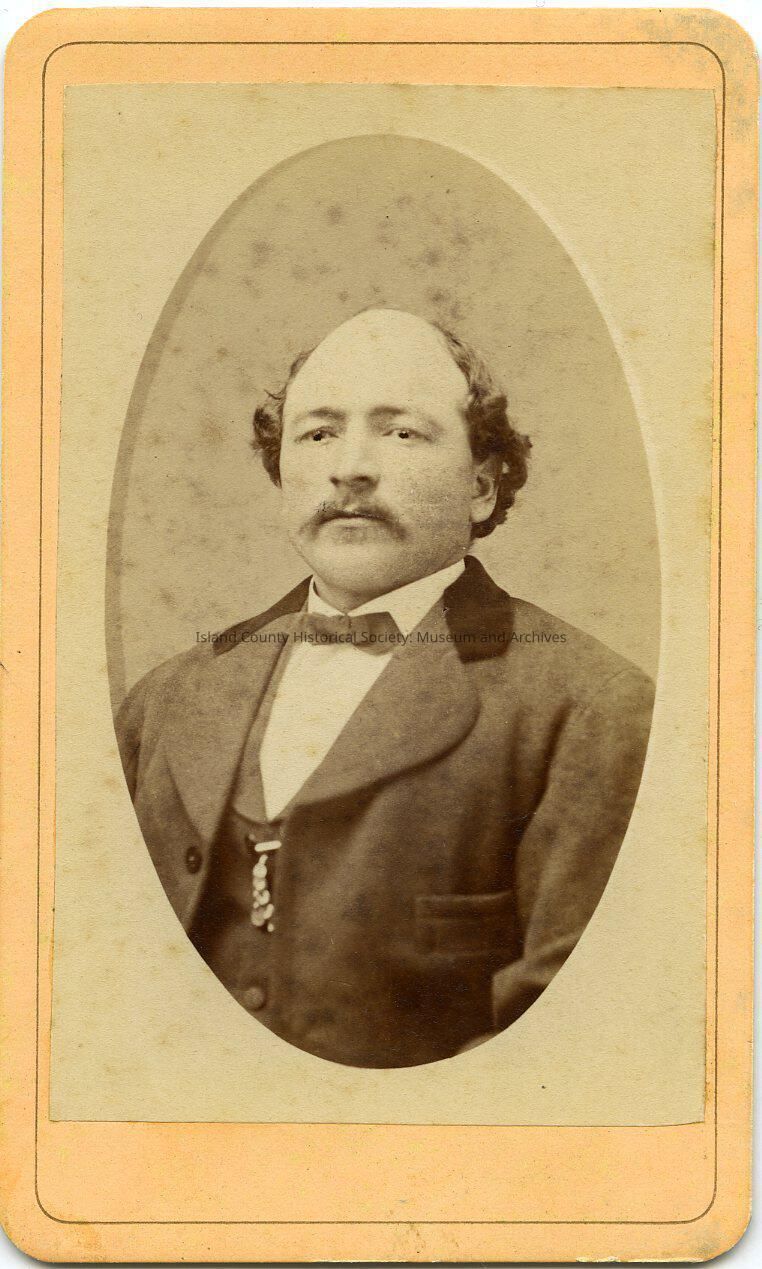 A studio photo of a man sitting facing slightly to his right but looking at the camera. He has a bald forehead, drooping mustache. Wearing a suit with wide curved lapels and probably velvet collar, small bow tie, watch fob on his vest. From the old entry: Captain Williams, from Coupe Family Album #14.