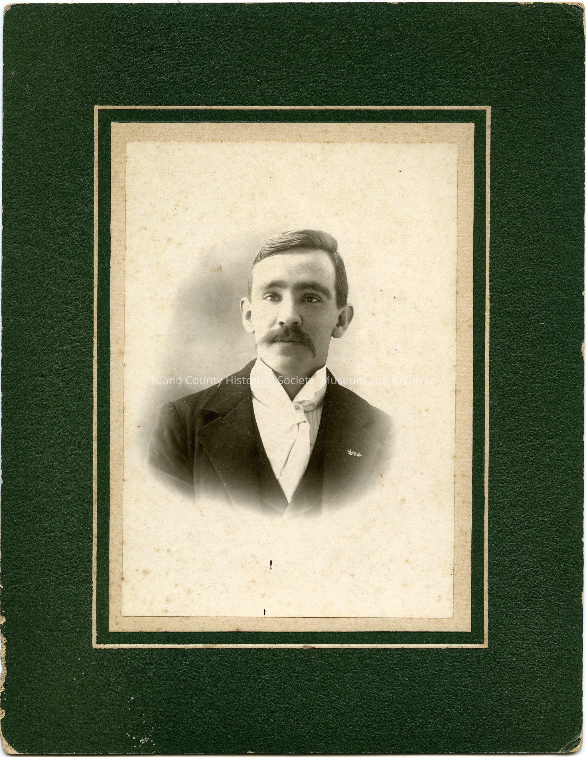 Studio photo of a man from the shoulders up. He is wearing a suit with win collar shirt, tie with a pin in the center fold. He has a large mustache. On the back: Dan Zent From the Zent, Dan folder
