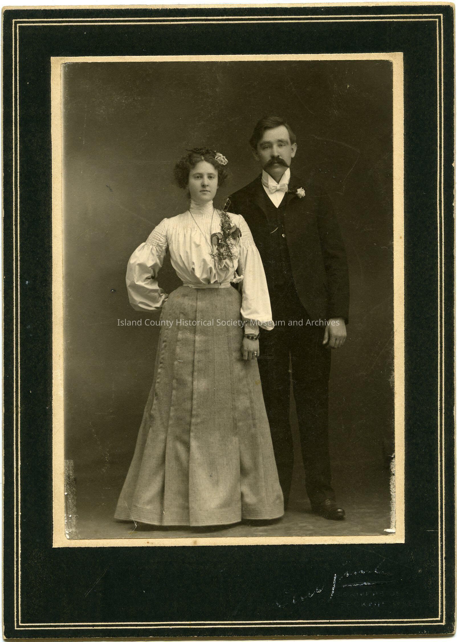 Studio photo of a man and woman, probably their wedding photo. She is wearing a long skirt with pleats at the knees, a puff-sleeved blouse with a high collar, large corsage on her left shoulder, necklace and a flower in her hair. He is wearing a suit, winged collar, bow tie, buttoniere. On the back: Dan Zent and wife.