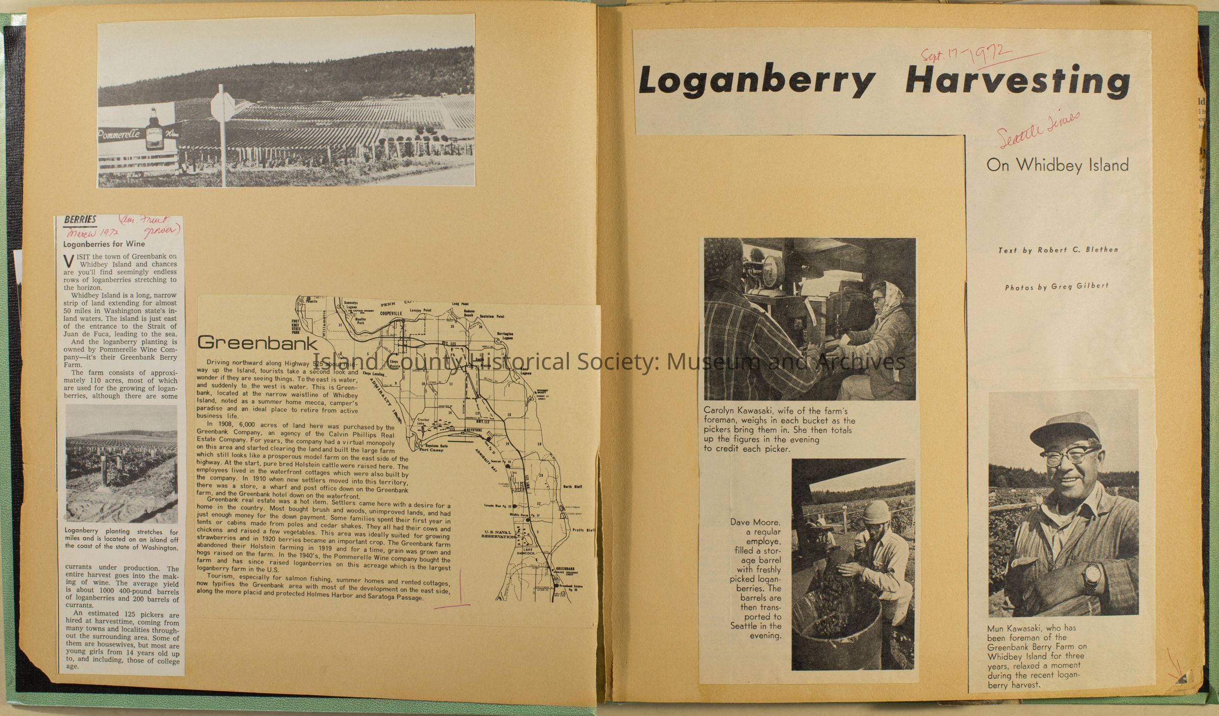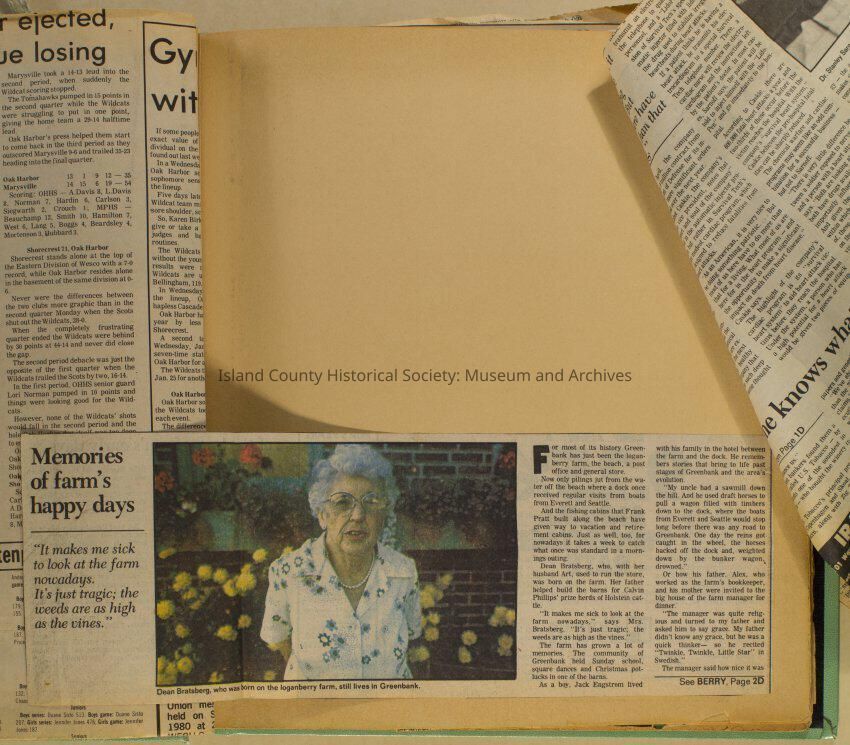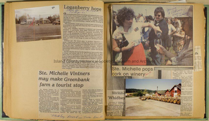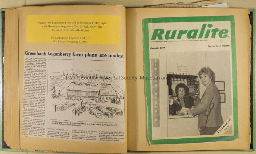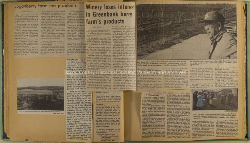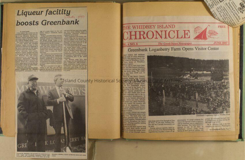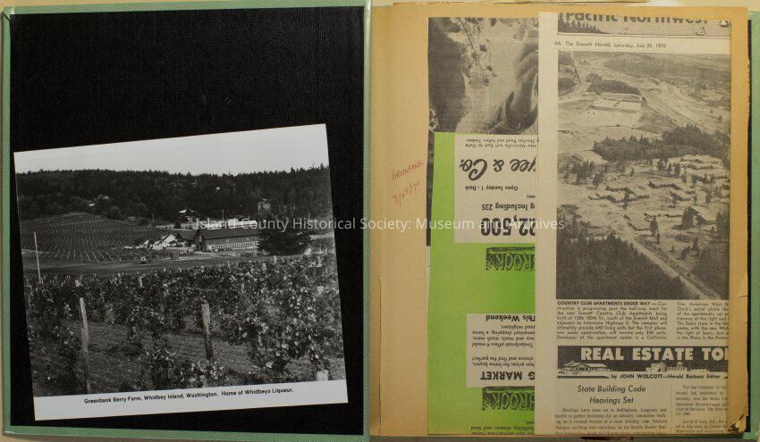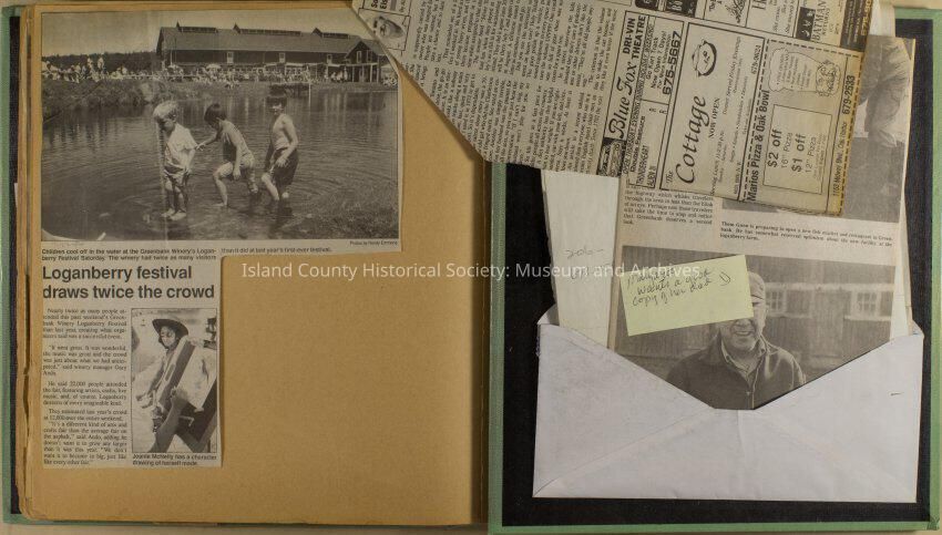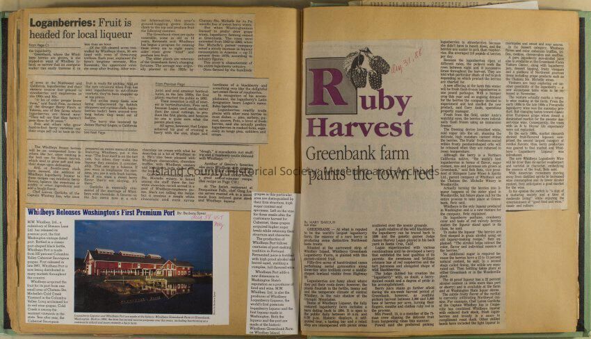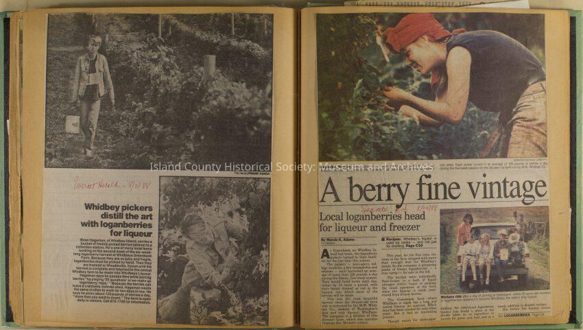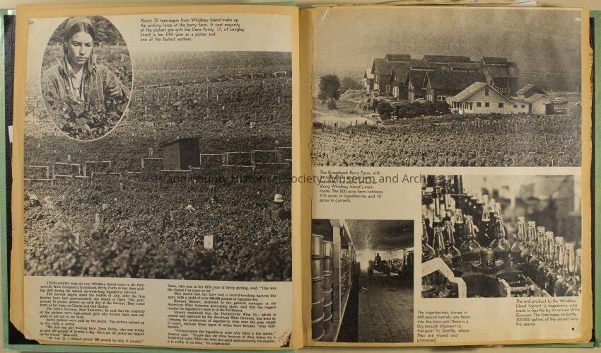 Greenbank scrapbook, photos, newspaper clippings concerning Greenbank farm and Greenbank. Digital copy only of scrapbook donated by Margaret Kawasaki and parents Mun and Carolyne who managed the Farm during the 70s and 80's as a Loganberry farm.