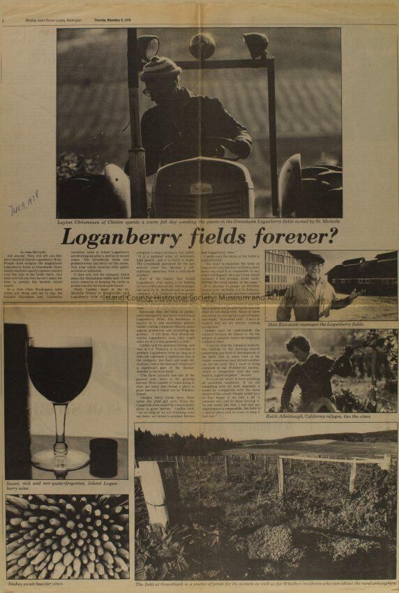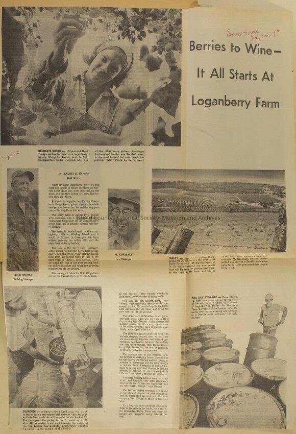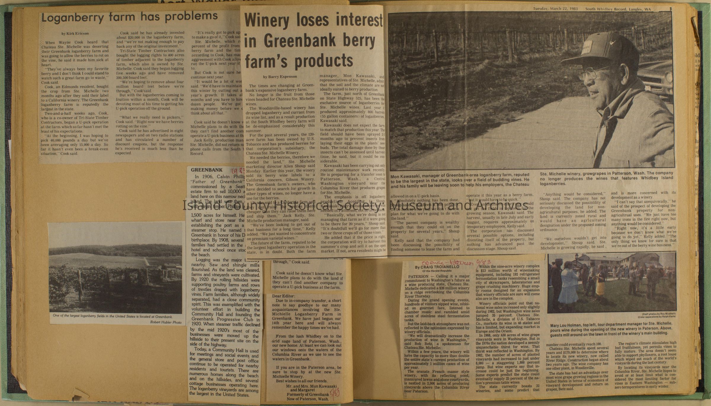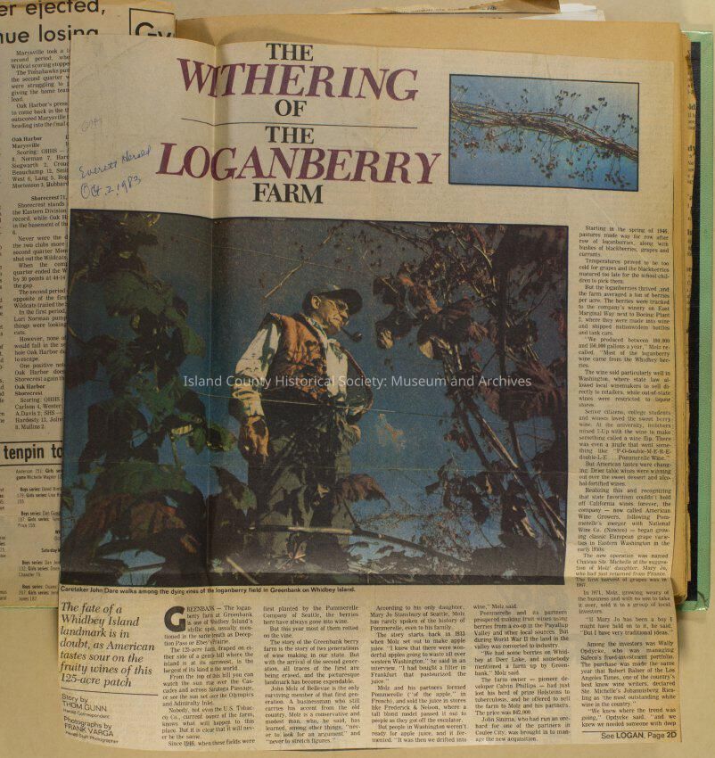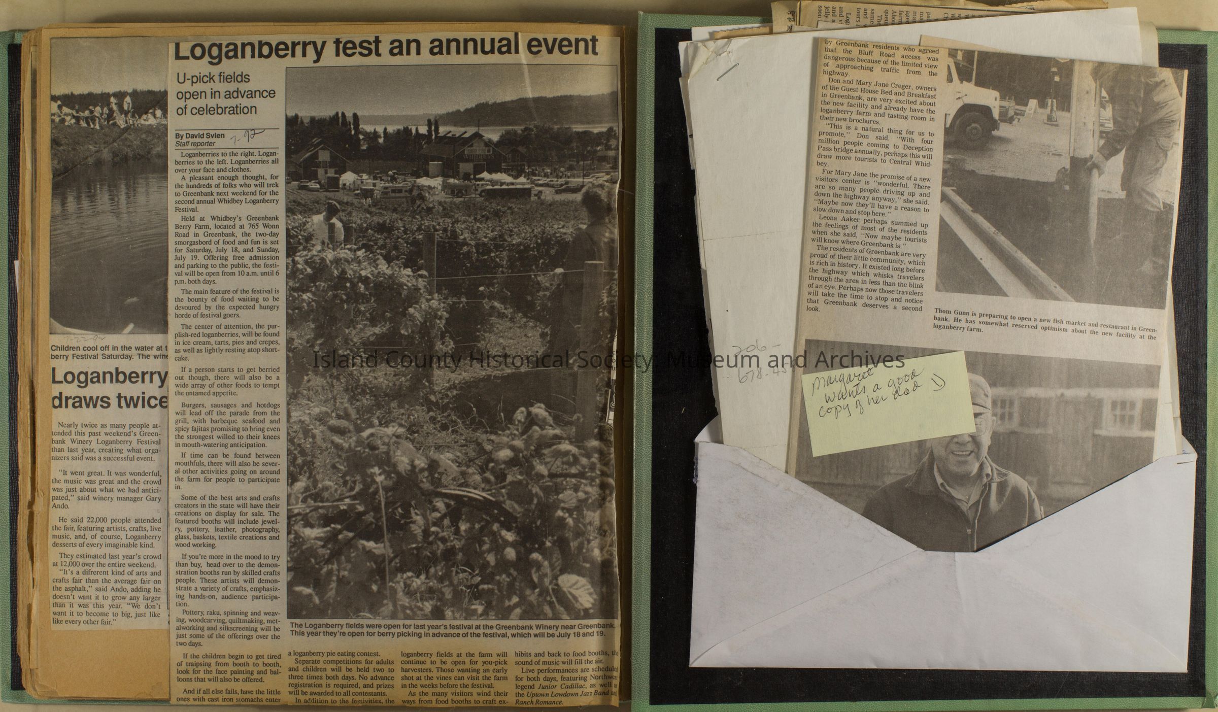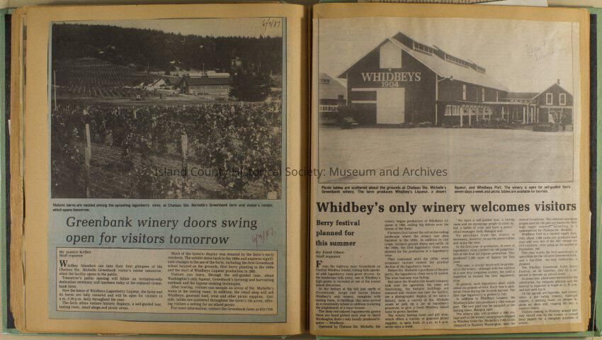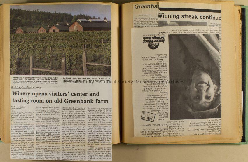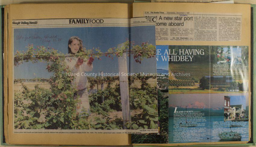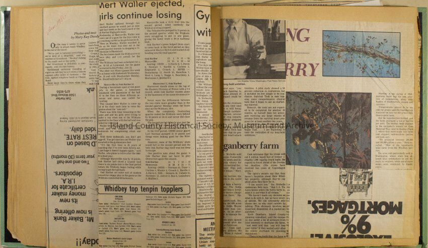 Greenbank scrapbook, photos, newspaper clippings concerning Greenbank farm and Greenbank. Digital copy only of scrapbook donated by Margaret Kawasaki and parents Mun and Carolyne who managed the Farm during the 70s and 80's as a Loganberry farm.