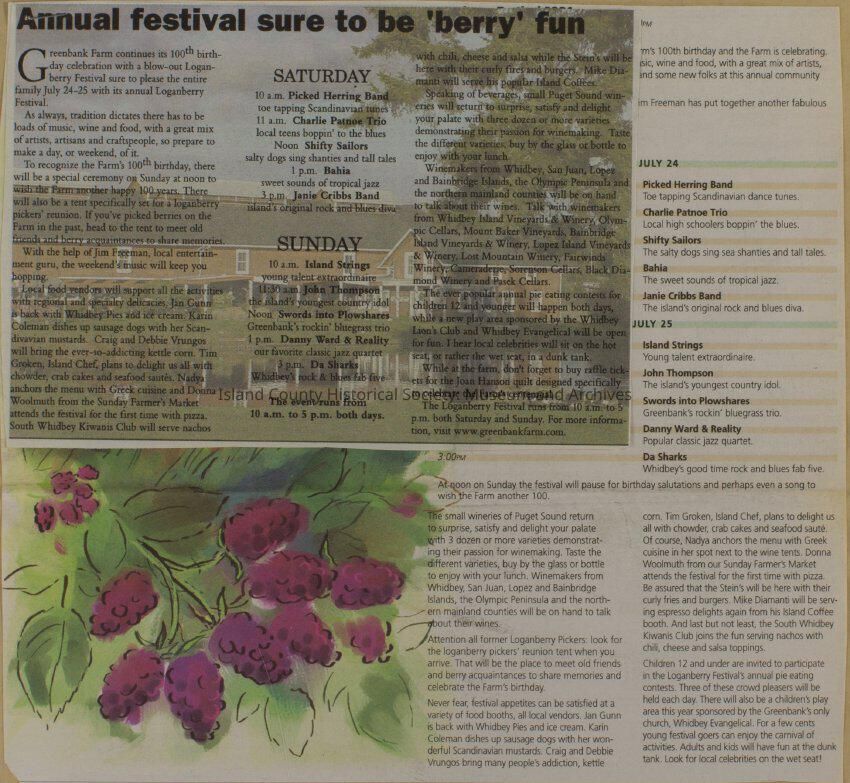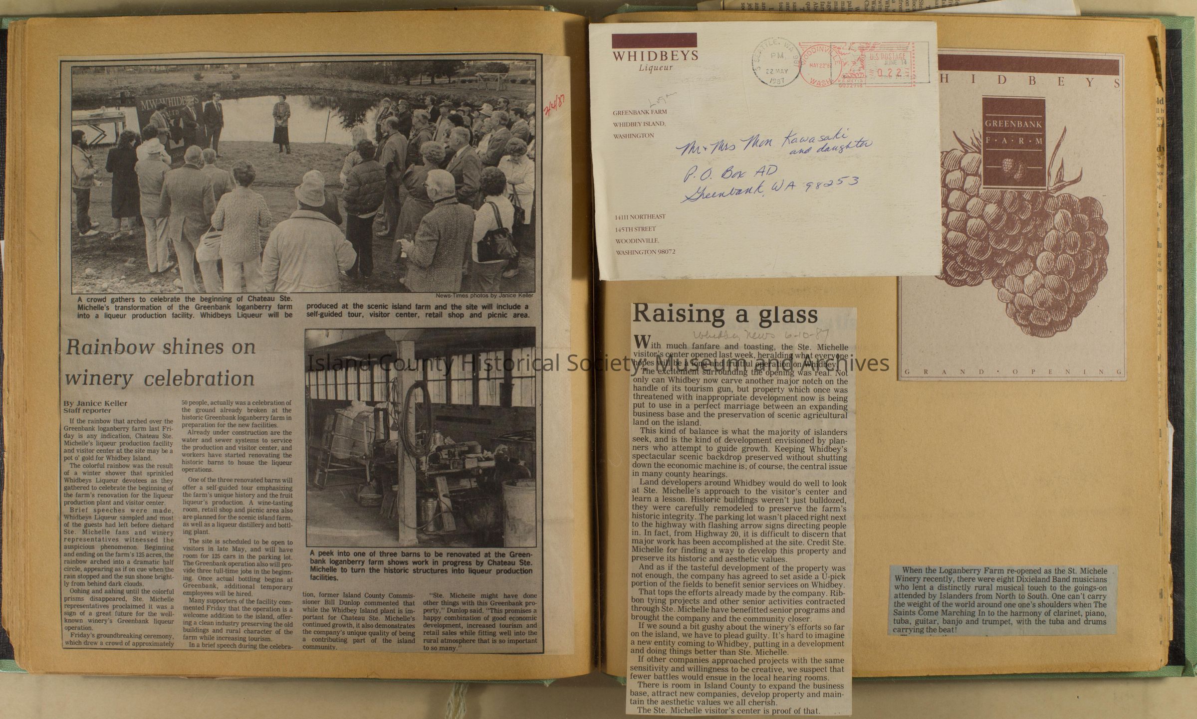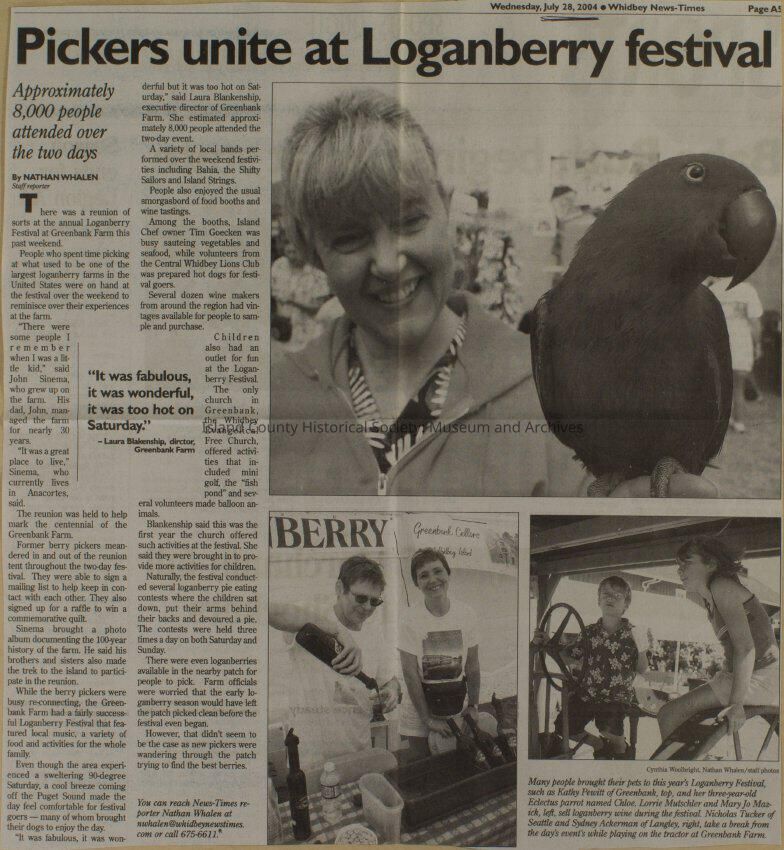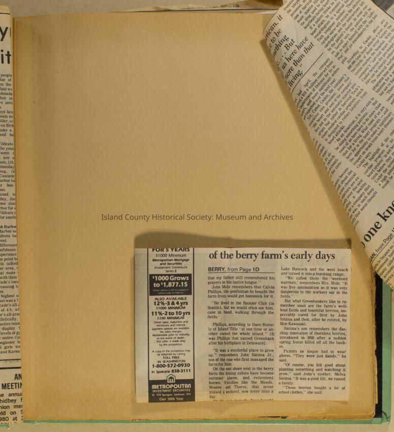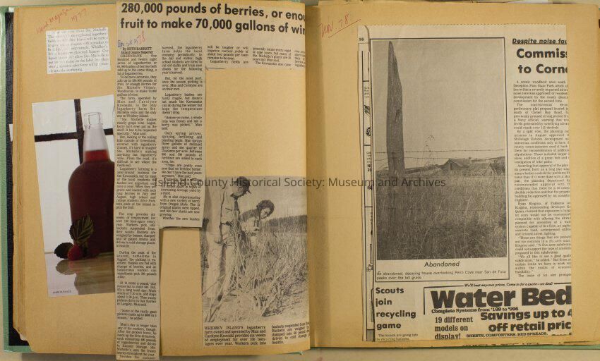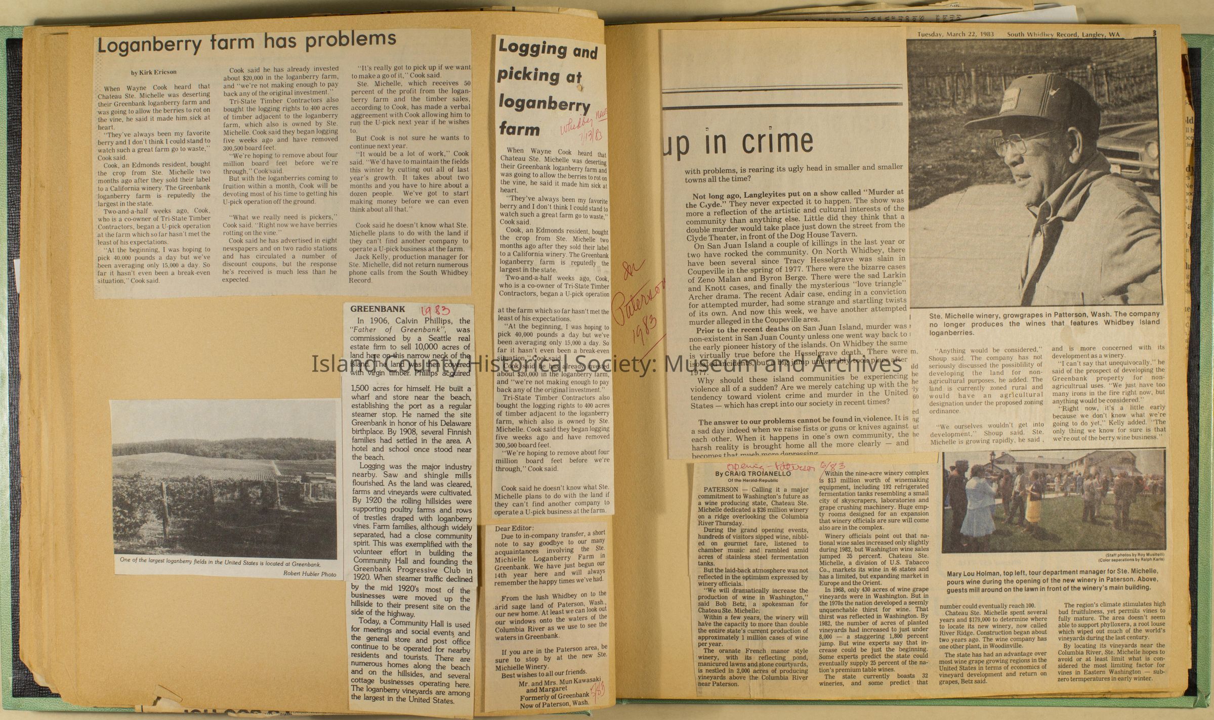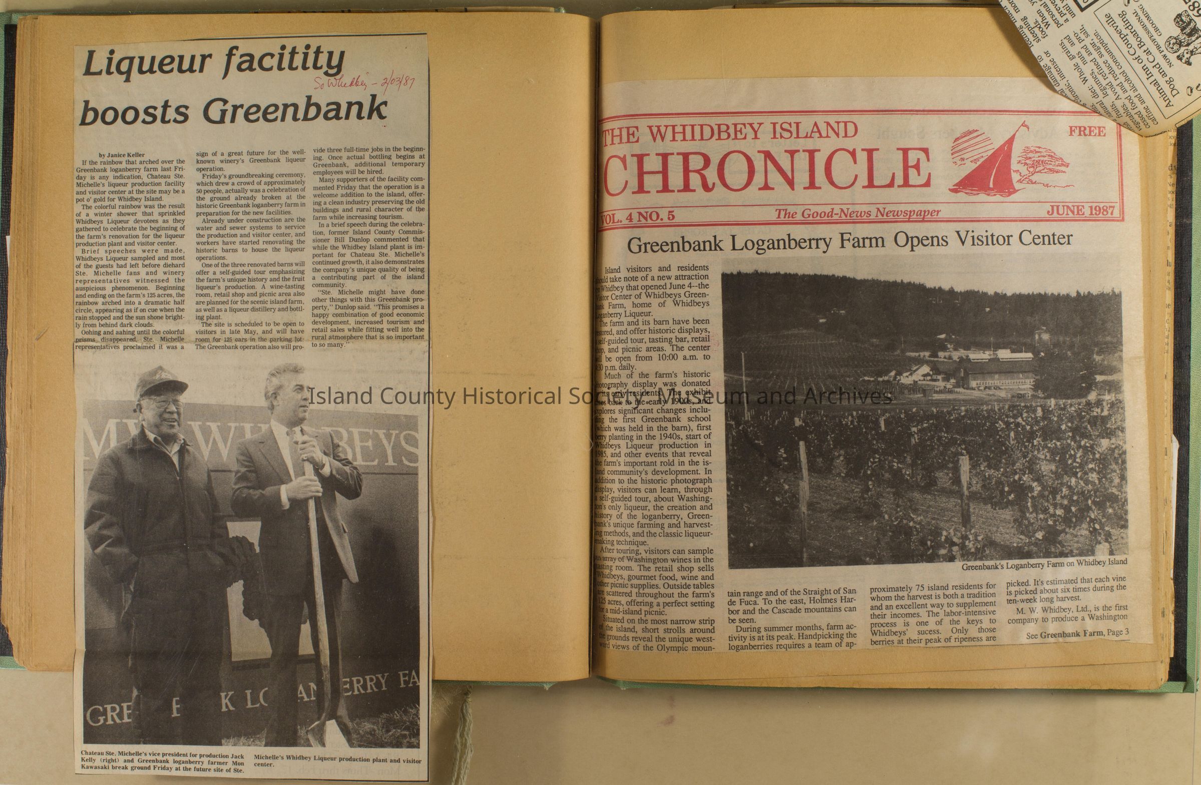 Greenbank scrapbook, photos, newspaper clippings concerning Greenbank farm and Greenbank. Digital copy only of scrapbook donated by Margaret Kawasaki and parents Mun and Carolyne who managed the Farm during the 70s and 80's as a Loganberry farm.