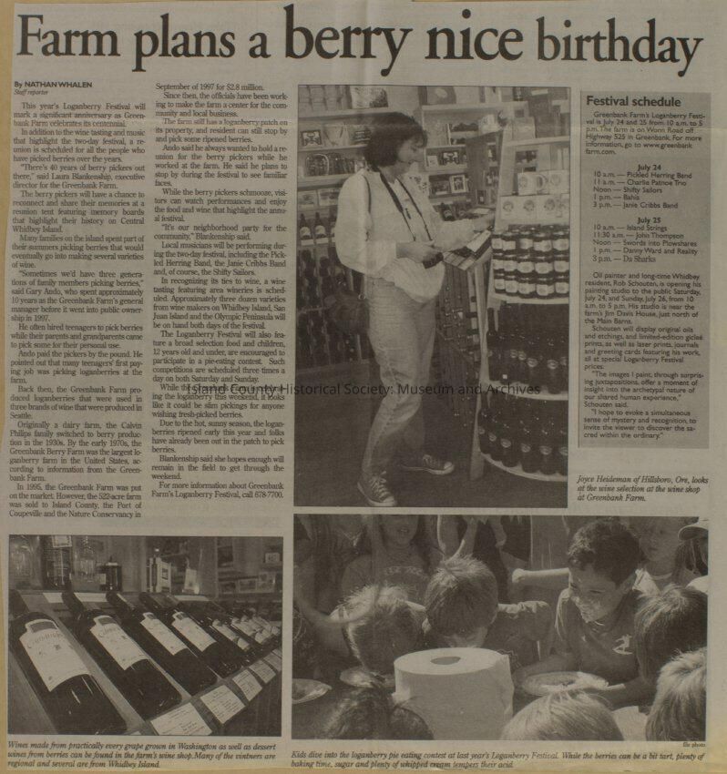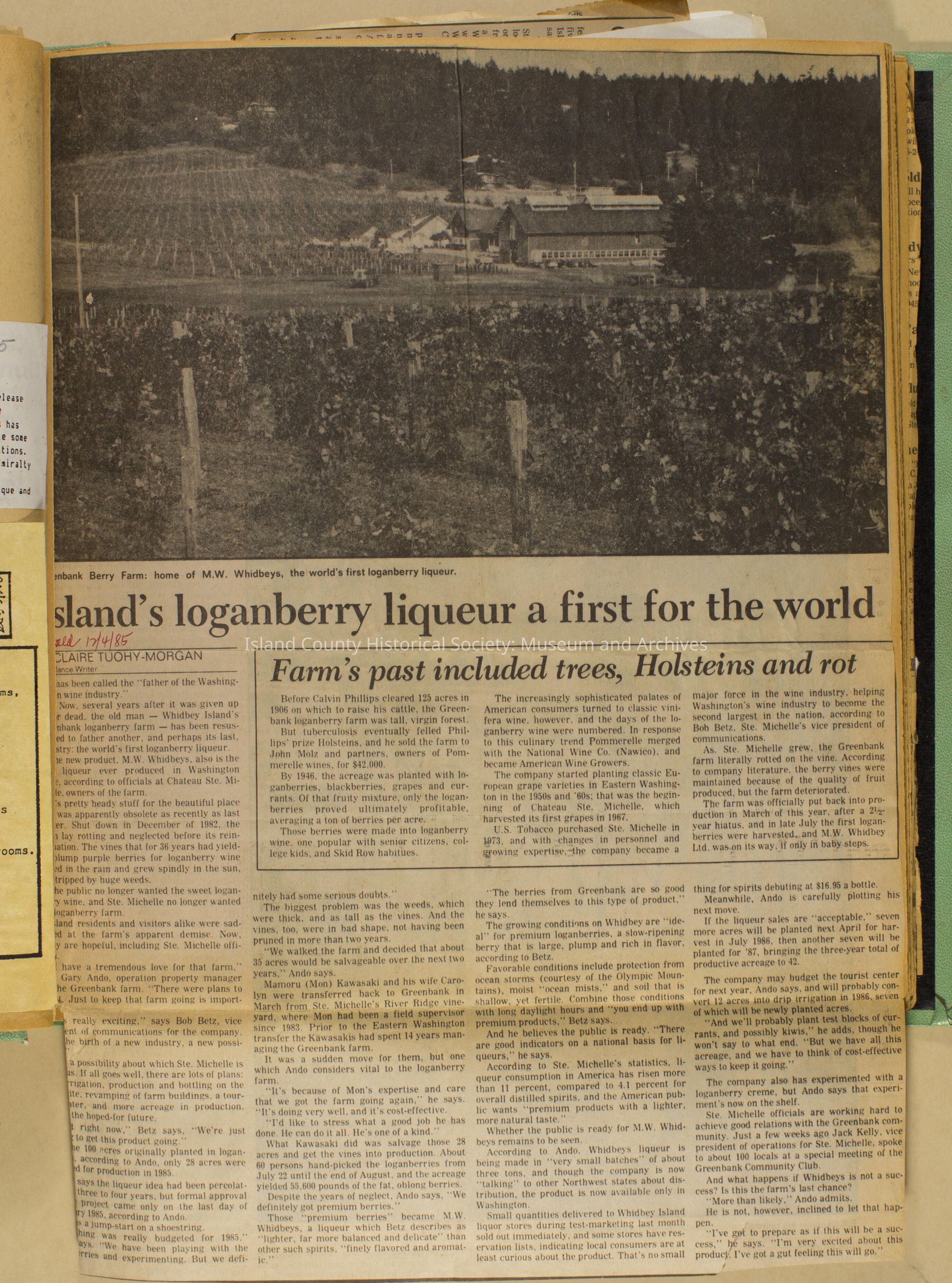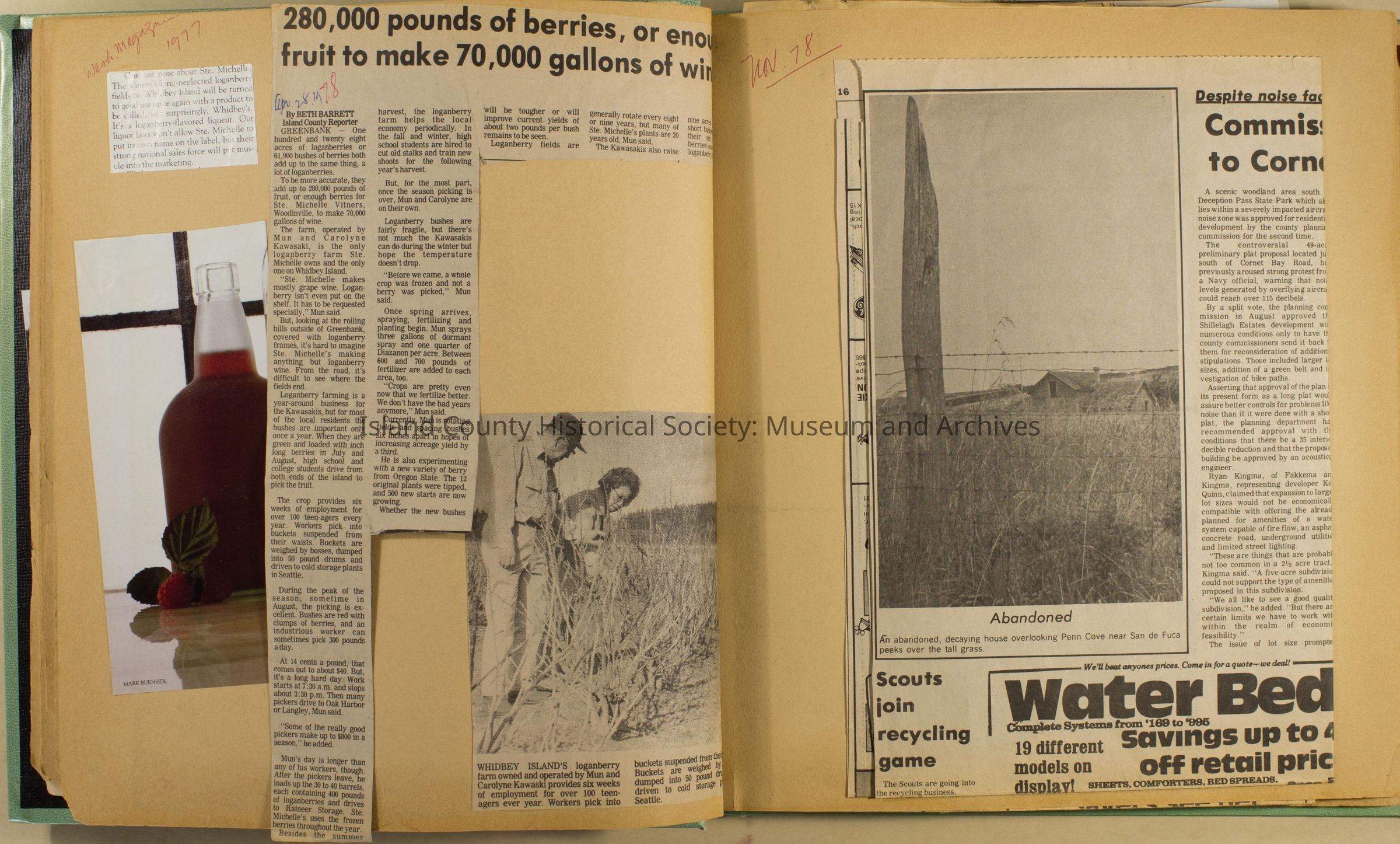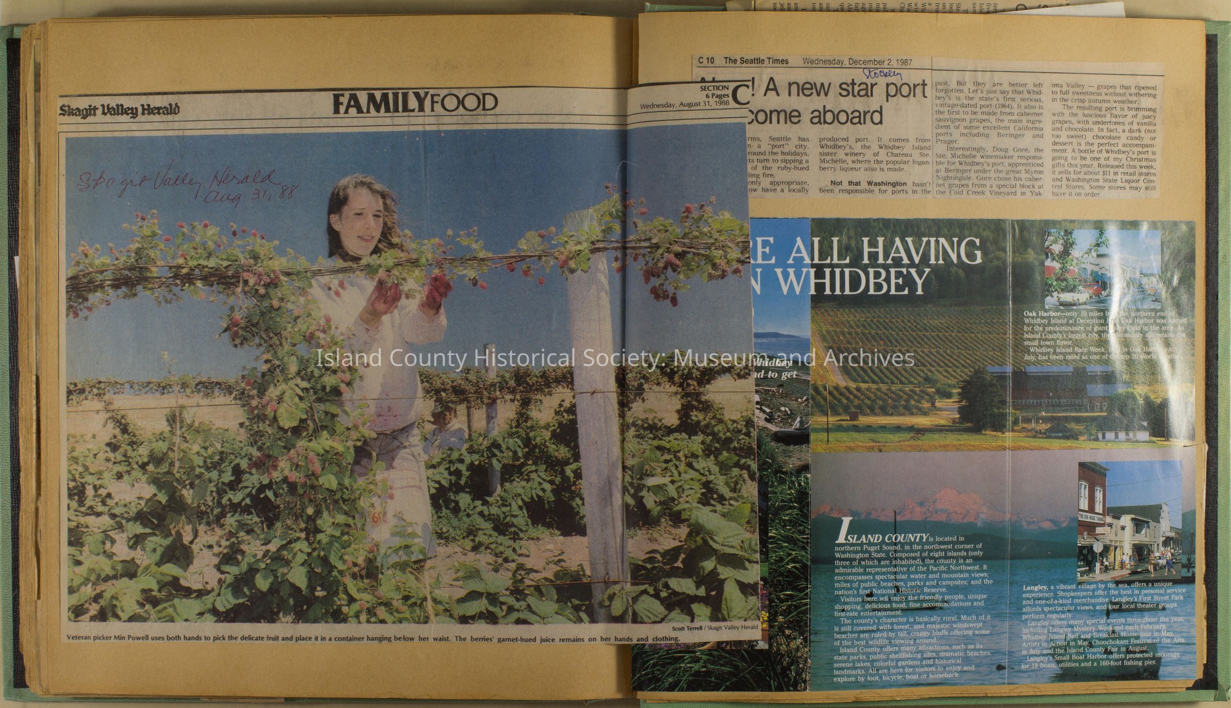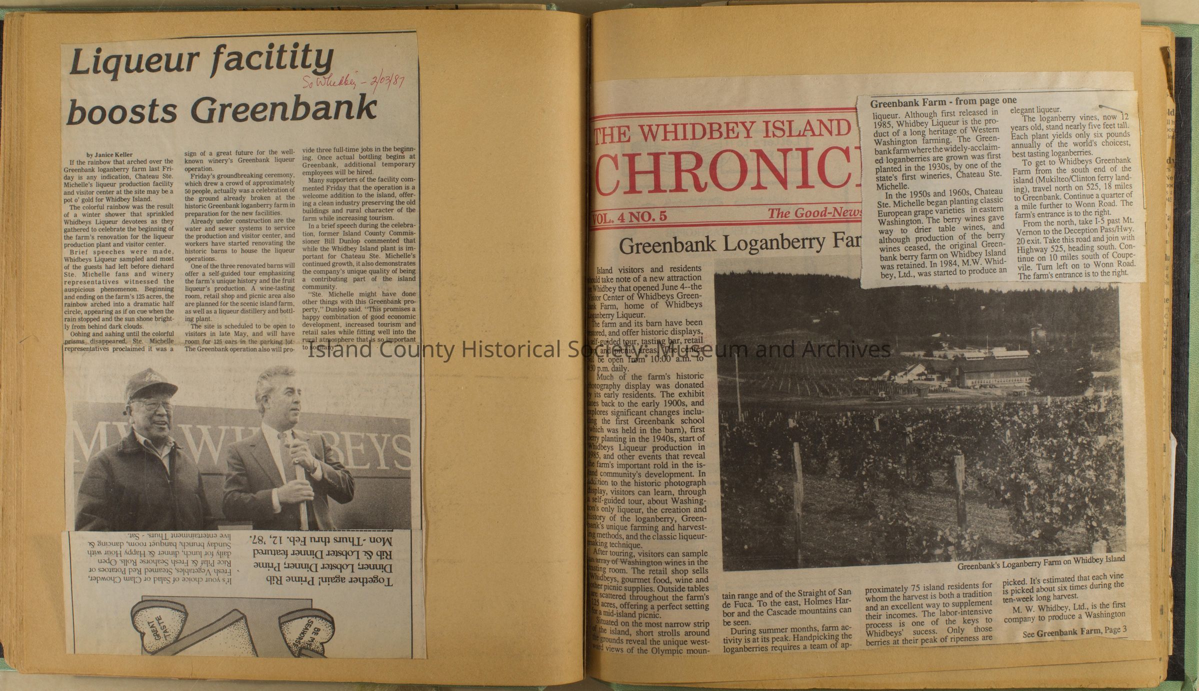 Greenbank scrapbook, photos, newspaper clippings concerning Greenbank farm and Greenbank. Digital copy only of scrapbook donated by Margaret Kawasaki and parents Mun and Carolyne who managed the Farm during the 70s and 80's as a Loganberry farm.