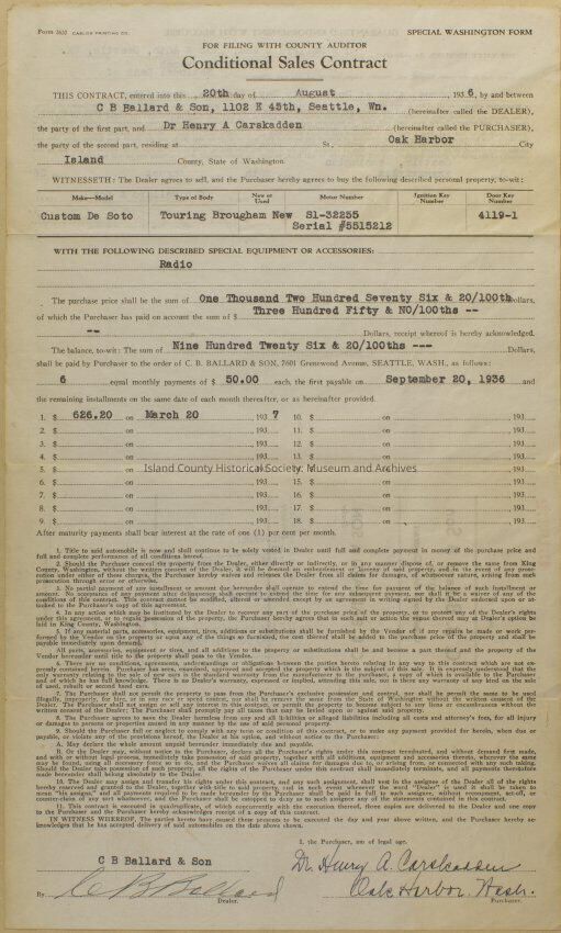 A sales contract for Dr. Henry A Carakadden for a Custom De Soto car.
