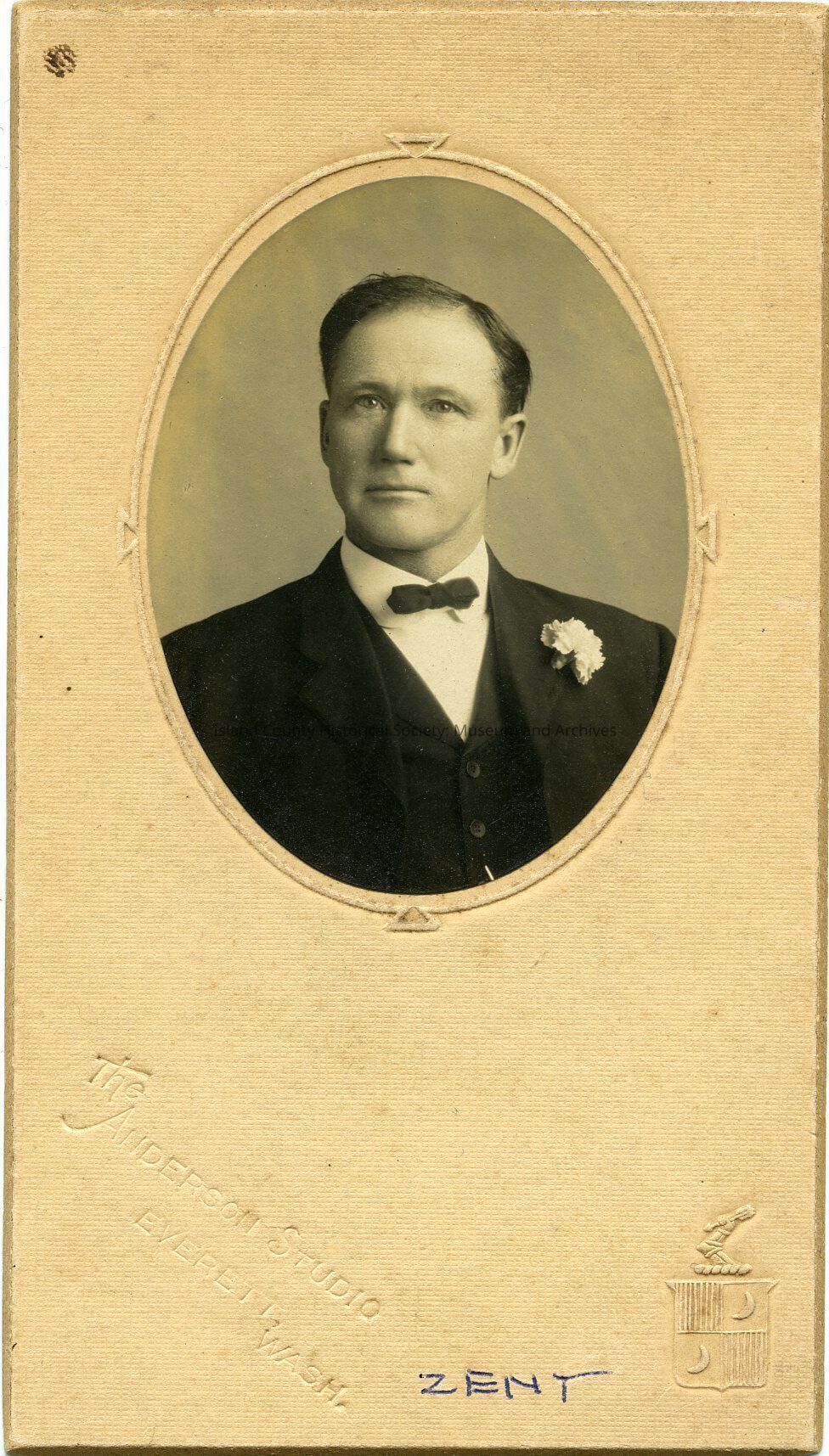 Studio photo of a man wearing a suit, flower in his lapel (buttoniere), small bow tie. Hs is looking slight to his right. The image is oval on a rectangular cardstock. Written on the front bottom: Zent. A shield emblem is on the lower right corner.