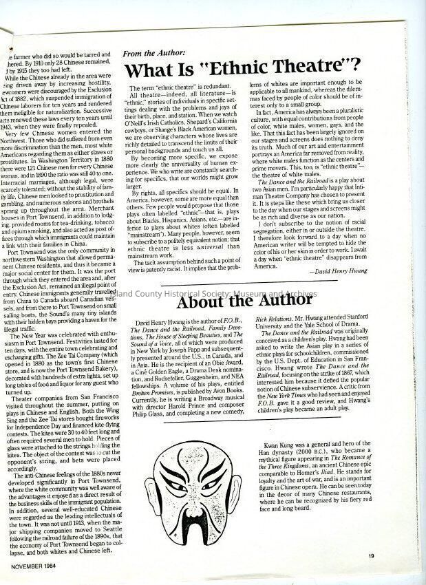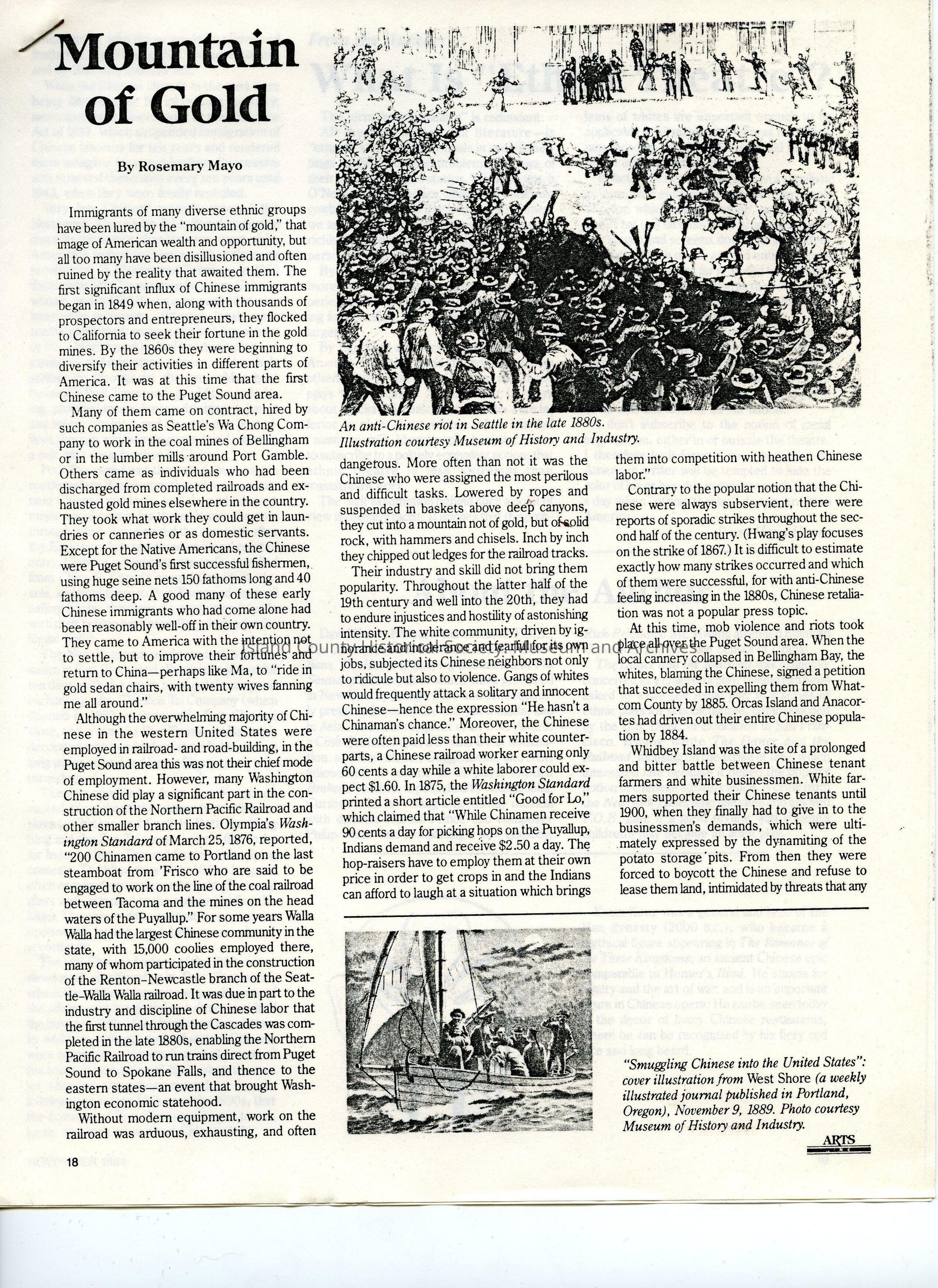 An article entitled, "Mountain of Gold" by Rosemary Mayo, November 1984 (publication unknown). Discusses Chinese immigrants, work, treatment.