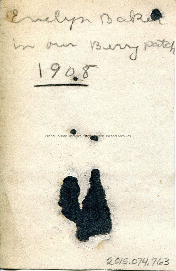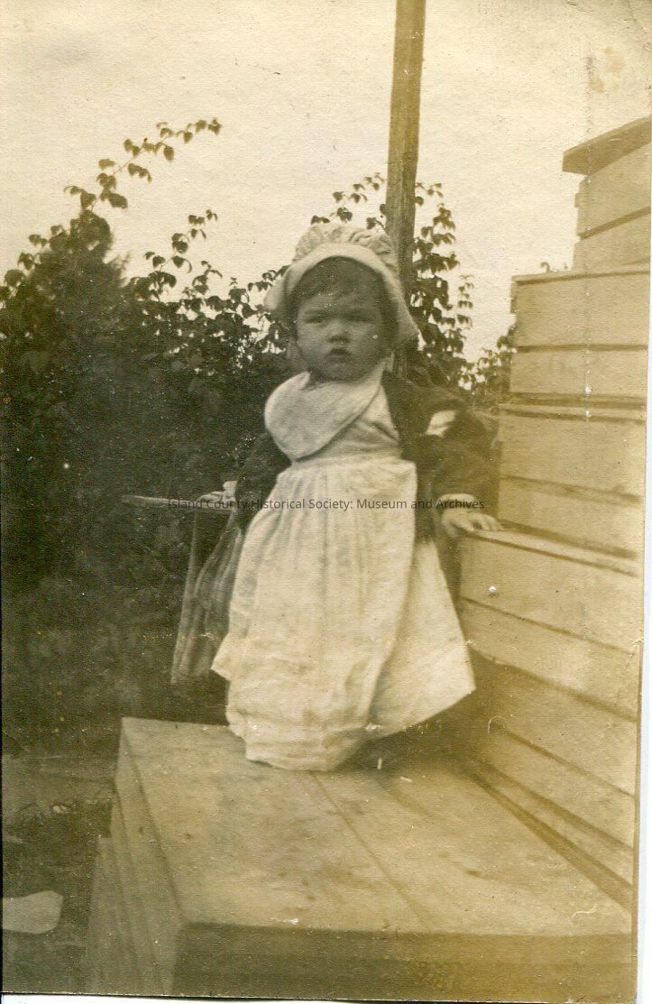 On back of photograph: "Evelyn Baker in our Berry patch 1908" Evelyn as a toddler is standing on top of some berry containers/flats wearing a dress, jacket, and a bonnet. She is leaning against a stack of berry containers/flats.
