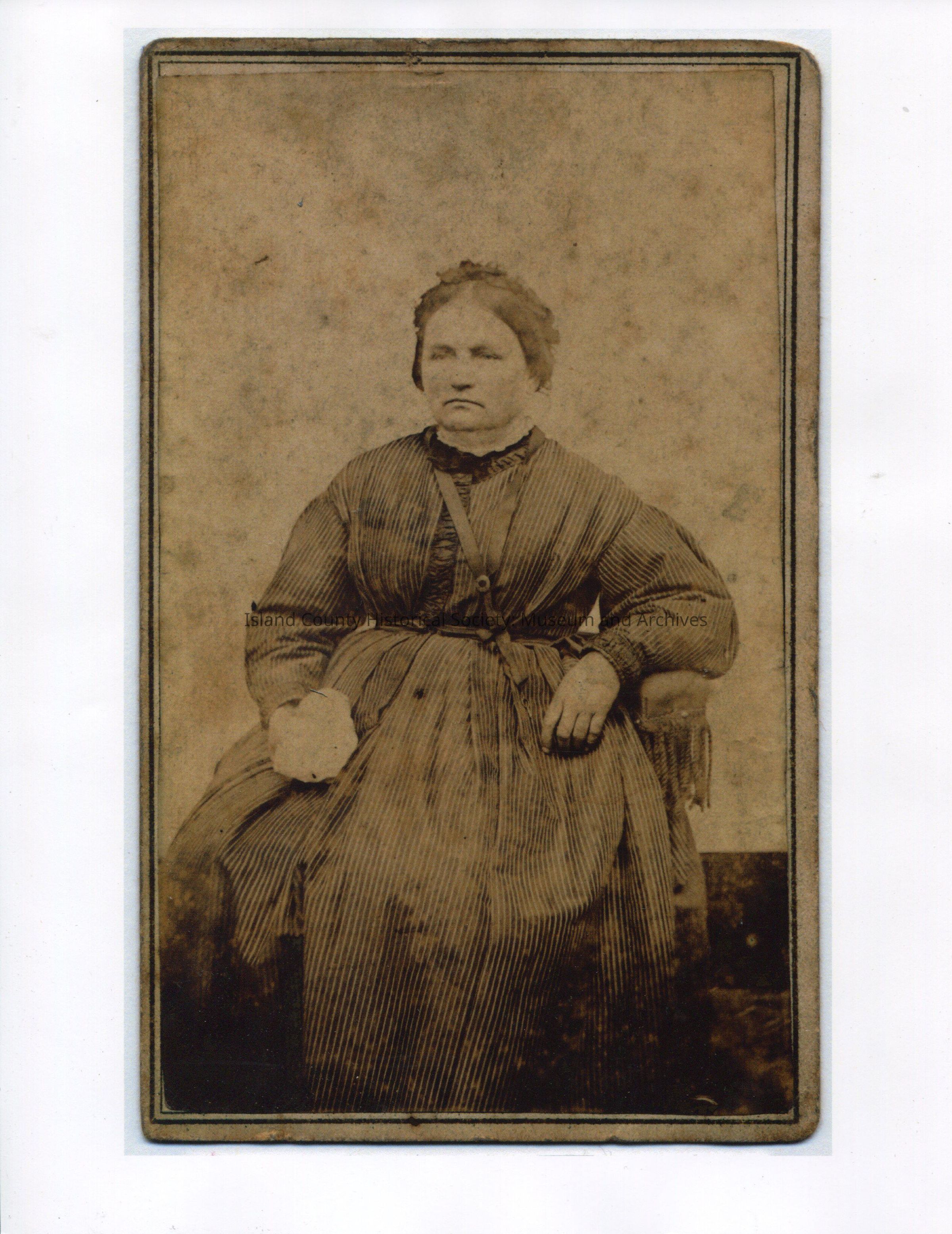 A photo of a woman sitting down. Note on the front says "Mary Bozarth w/o Urban E Bozarth. Restricked use. Contact Bancroft (?) Library, Univ. of Cal, Berkeley."