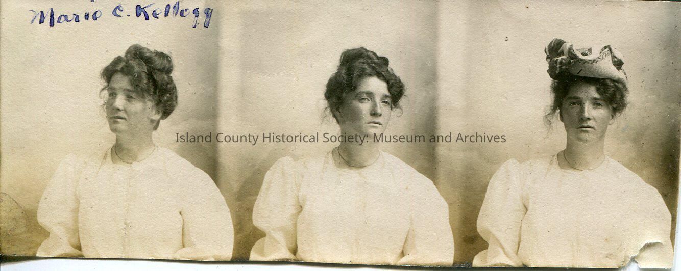 On back of photograph: "Marie C. Kellogg" in cursive On front: "Marie C. Kellogg" It is a photostrip featuring Marie in three different poses including angled shots and one of her looking directly into the camera wearing a hat.