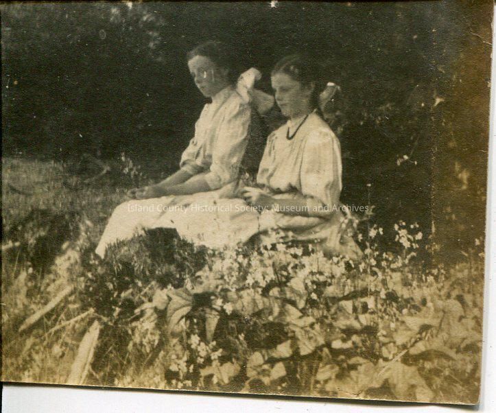 A black and white photo of two young women sitting in tall grass. Both girls are wearing white dresses and have large white bows in their hair. The girl on the right side of the photo is wearing a necklace. Neither girl is looking at the camera. The back of the photo says, "Anne + Genissa (?) by the river".