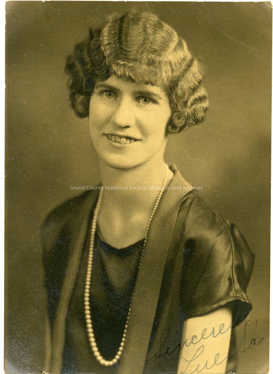 Studio portrait of a young woman wearing a satin dress and overdress, long pearly necklace, waved hair. On the front is written: Sincerely, Luella. On the back: Luella Zylstra Pierce. Zylstra, Luella (m. name Pierce)