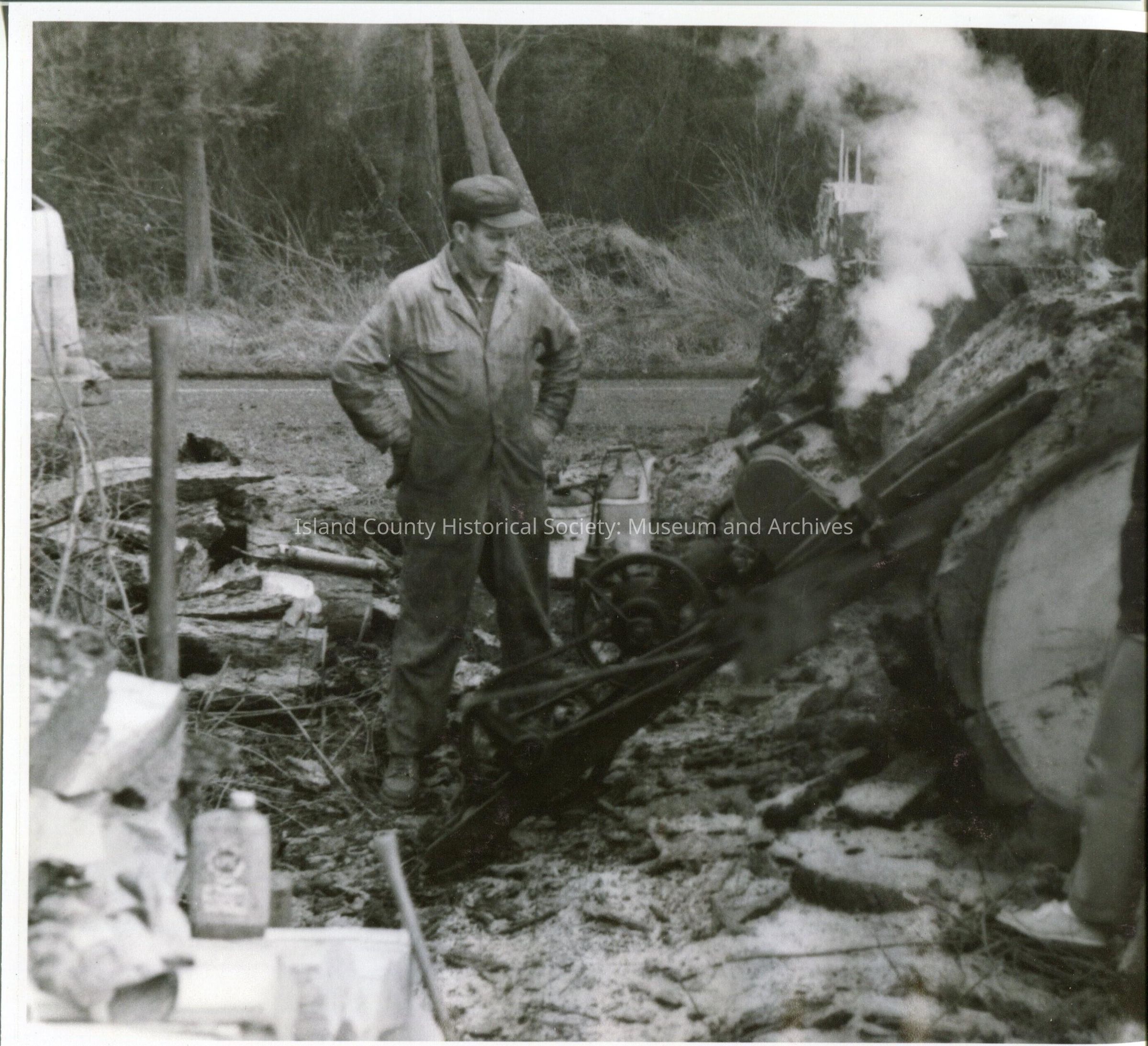 A photo of a two men outside with a huge log and smoke coming from something. Machine/engine powered saw. Log is about 3-4 feet in diameter.