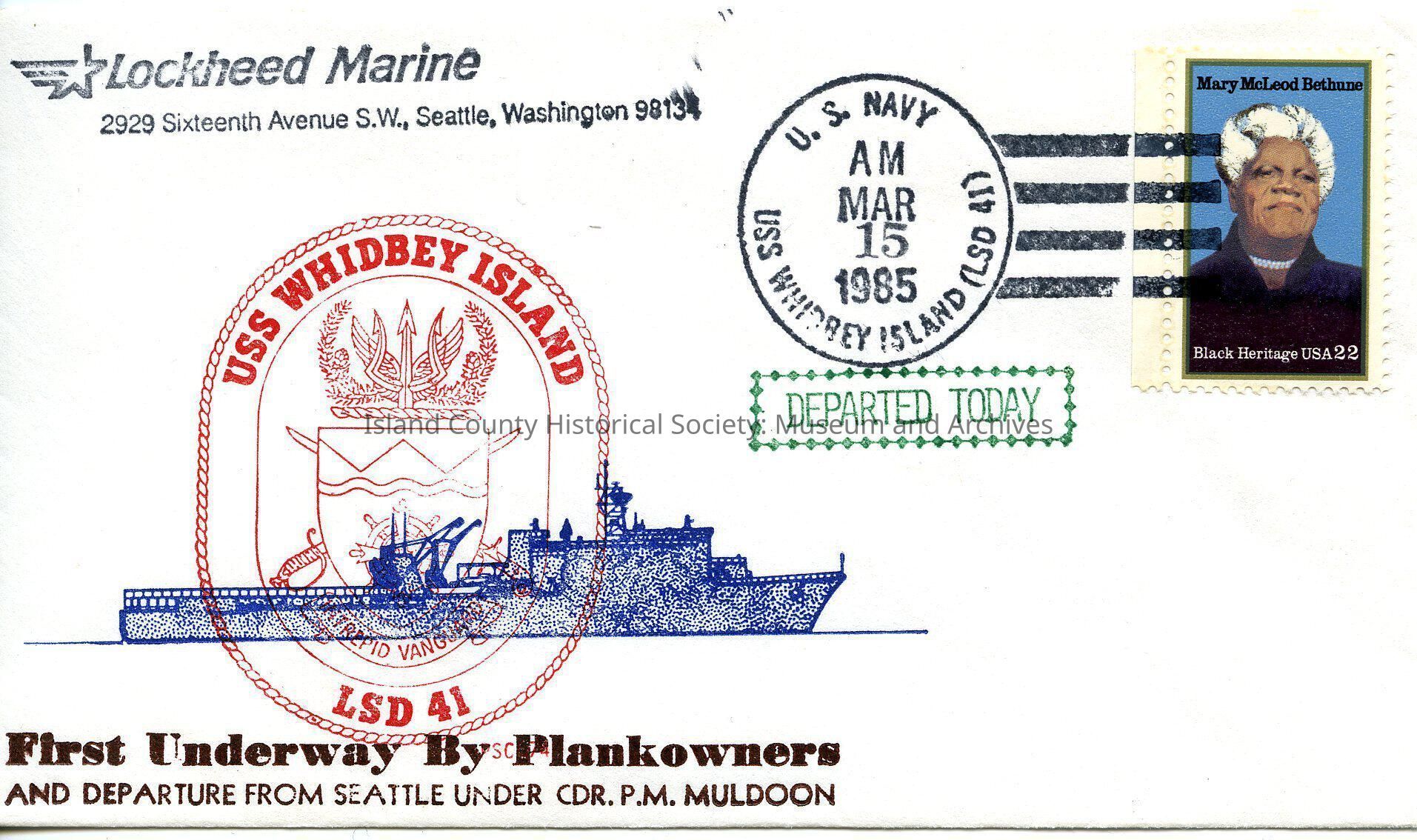 Small envelope with U.S.S. Whidbey Island, LSD-41, Load Ship Deck, Lead Ship of the Class for the United States Navy. Postmarked from U.S. Navy USS Whidbey Island (LSD 41) Mar 15, 1985.