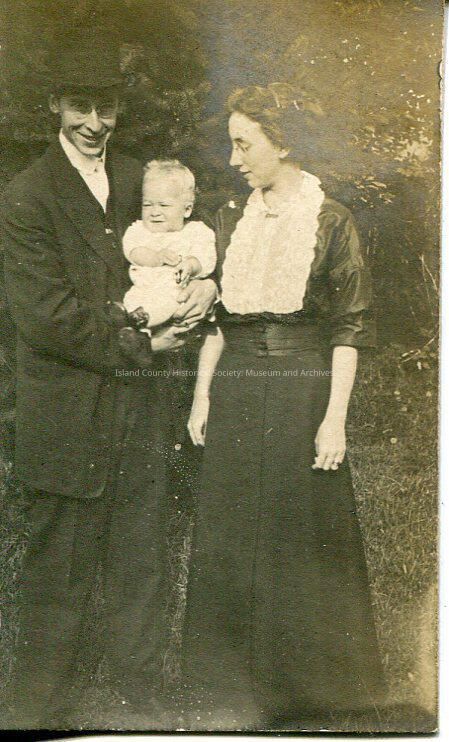 A photo of a couple and a baby. The woman is wearing a dark-colored dress with a white collar. She is also wearing glasses and has her hair pulled back. The man is wearing a suit, a hat and glasses. He is holding the baby. The baby is in a white outift. The man is looking at the camera and the woman is looking at the baby. On the back "'Yours truly' 'Holdin' my own'" is written.