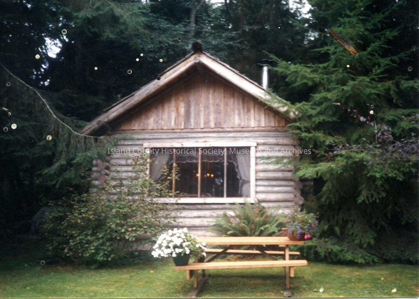 Guest House Bed & Breakfast, Greenbank. Side view of log cabin. Large window with frilled curtains visible inside. Picnic table in foreground. Potted plants, shrubs and ferns. Cabin surrounded by fir trees.