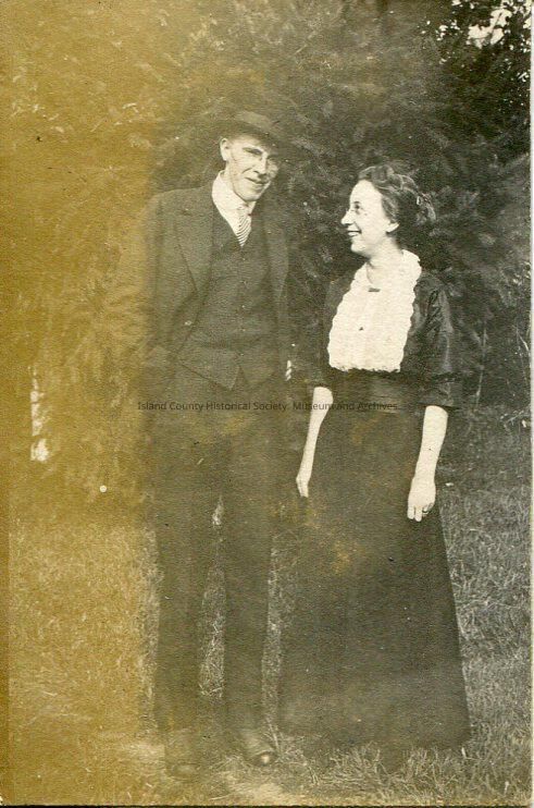 A photo of a couple standing outside. The man is wearing a dark colored suit and hat. He also is wearing glasses. The woman is wearing a dark colored dress with a white collar. She is also wearing glasses and has her hair pulled back. The man is looking at the camera and the woman is looking at the man, smiling. The back of the photo says, "Some other (?), Sept. 19, 1915".Made/Created