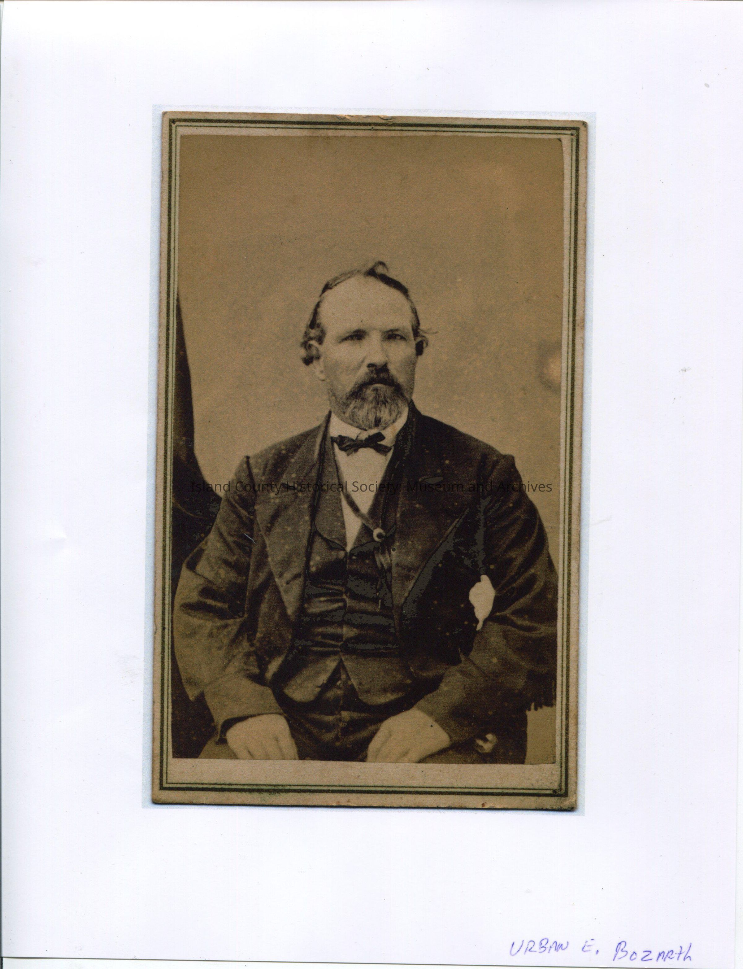 A photo of a man in a suit. On a note on the front is "Urban E. Bozarth, 1819-1870. Restricked use, Contact Bancroft Library, Univ. of California, Berkley."Lexicon