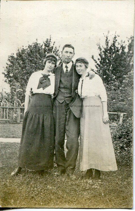 A photo of two women and a man standing outside. The man is standing in the middle of the women and he is wearing a suit and tie. The women are both wearing skirts, white blouses and ties. There is a fence and trees in the background. The back of the photo says, " Off for Oregon. Oct. 1st, 1915".Made/Created