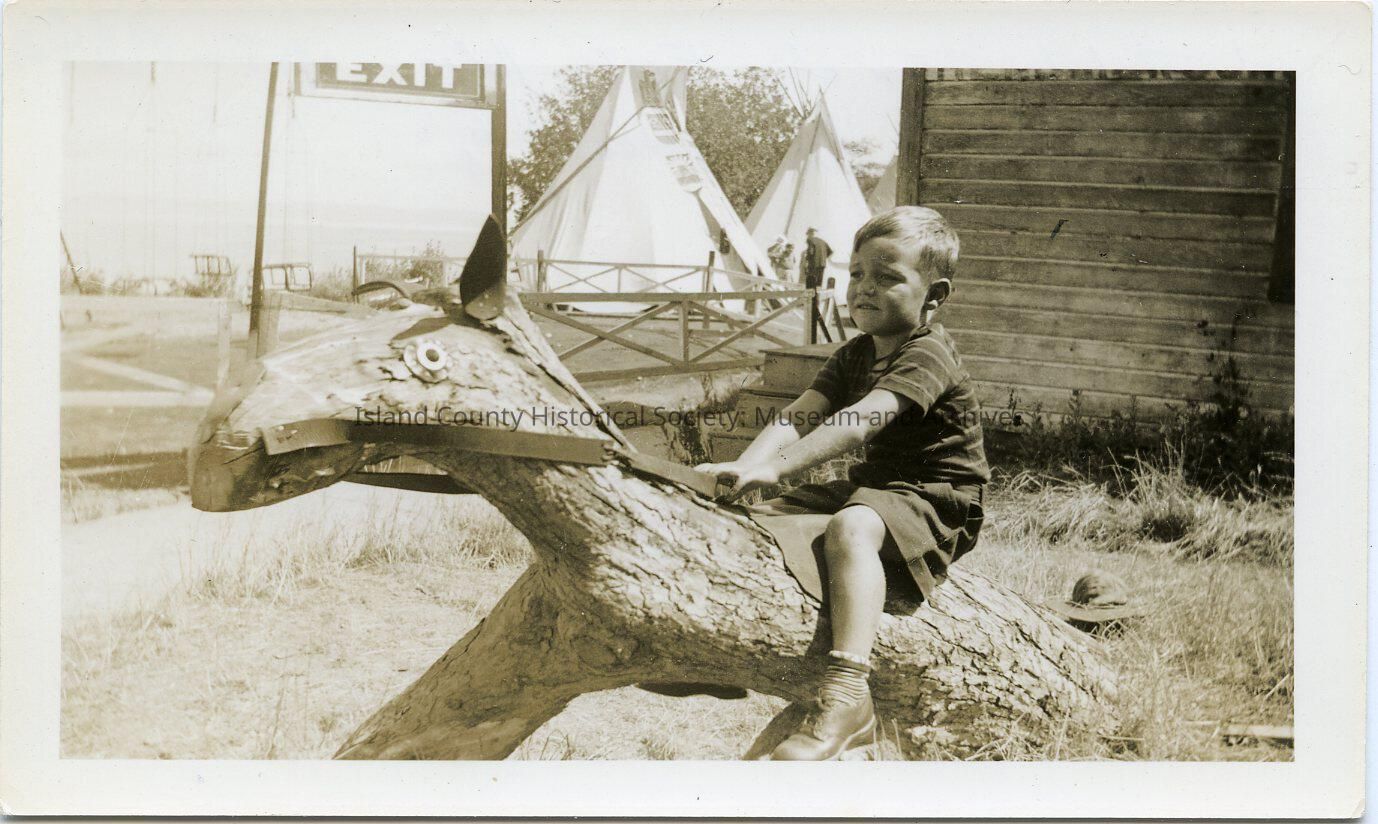 Photo of a boy "riding" a stump or log made to look like a horse; it has reins. In the background are two teepees and an EXIT sign. Hendrickson is in the wood of the building behind him. The boy is wearing a striped shirt, shorts, socks and shoes. On the back: Jim Zylstra, son of Earl & Helen Zylstra, grandson of James Zylstra, attorney.